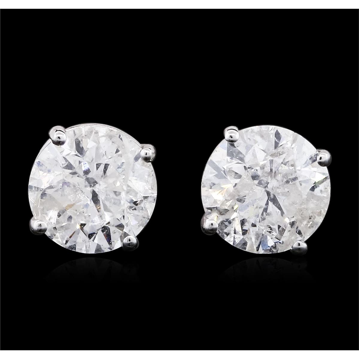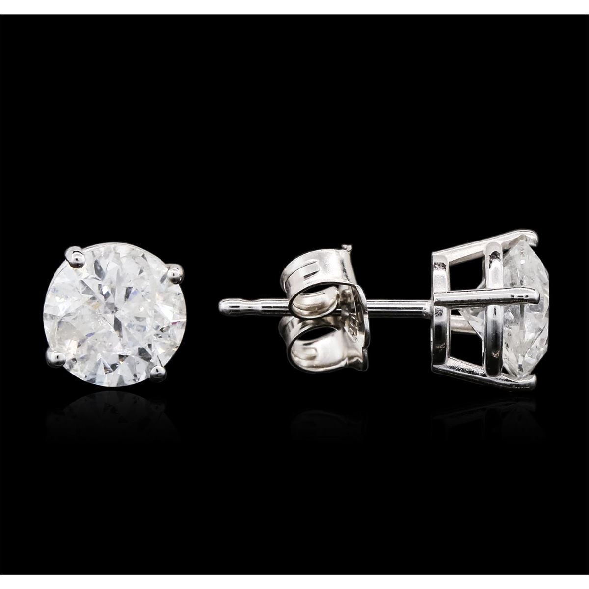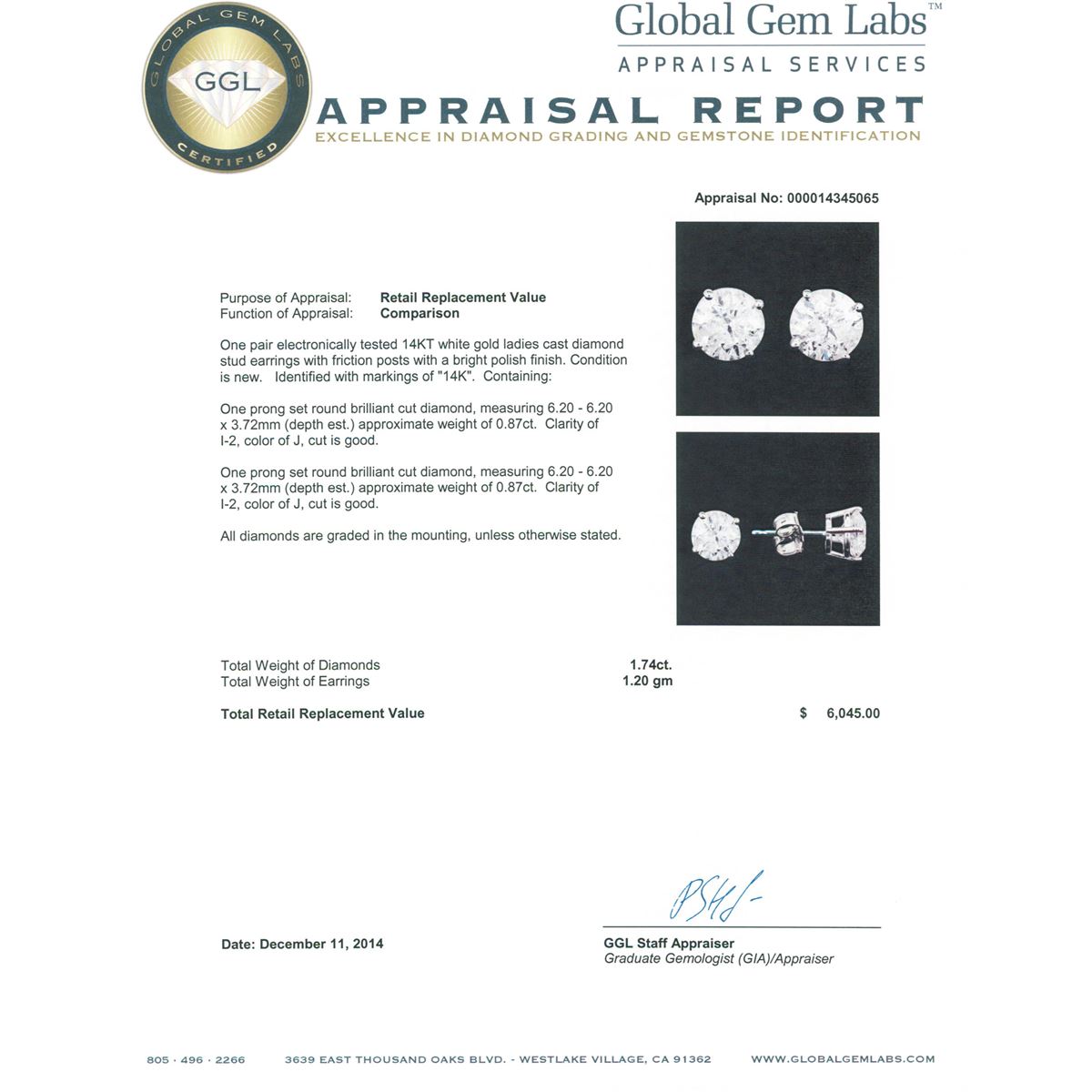 One pair electronically tested 14KT white gold ladies cast diamond stud earrings with friction posts with a bright polish finish. Identified with markings of "14K". Condition is new. Containing: One prong set round brilliant cut diamond, measuring 6.20 - 6.20 x 3.72mm (depth est.) approximate weight of 0.87ct. Clarity: I-2. Color: J, Cut is Good. One prong set round brilliant cut diamond, measuring 6.20 - 6.20 x 3.72mm (depth est.) approximate weight of 0.87ct. Clarity: I-2. Color: J, Cut is Good. All diamonds are graded in the mounting, unless otherwise stated. Total Weight of Diamonds 1.74ct. Total Weight of Earrings 1.20 grams. GGL Appraised at $6,045.00.