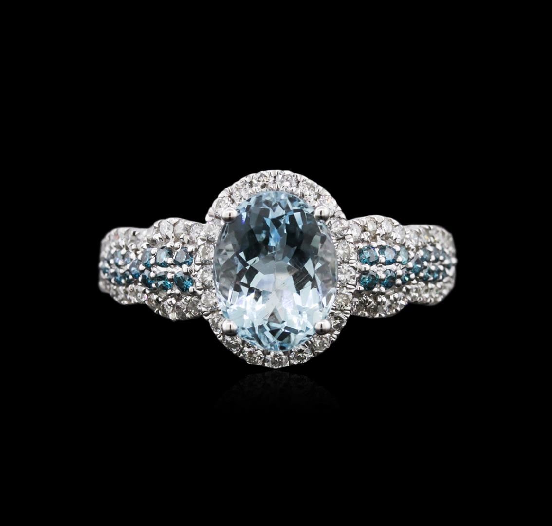 One ring featuring: 14KT white gold weighing 2.47 grams containing one aquamarine center stone with a total weight of 1.75ct, 28 blue diamonds with a total weight of 0.19ct and 61 round diamonds with a total weight of 0.47ct.