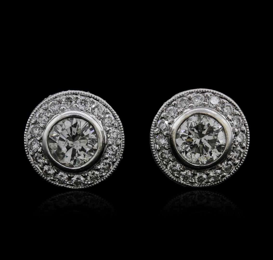 One pair electronically tested 14KT white gold ladies cast diamond earrings with friction posts with a bright polish finish. Identified with markings of "14K". Condition is new. Containing: Two bezel set round brilliant cut diamonds, measuring 5.50 - 5.50 x 3.30mm (depth est.) approximate total weight of 2 Stones = 1.22ct. Clarity: SI-2 to I-1. Color: I - J, Cut is Good. Ninety-Six prong set round brilliant cut diamonds, measuring 1.30 - 1.00 x 0.69mm (depth est.) approximate total weight of 96 Stones = 0.53ct. Clarity: SI-1 to SI-2. Color: I - J, Cut is Good. All diamonds are graded in the mounting, unless otherwise stated. Total Weight of Diamonds 1.75ct. Total Weight of Earrings 4.00 grams. GGL Appraised at $6,470.00.