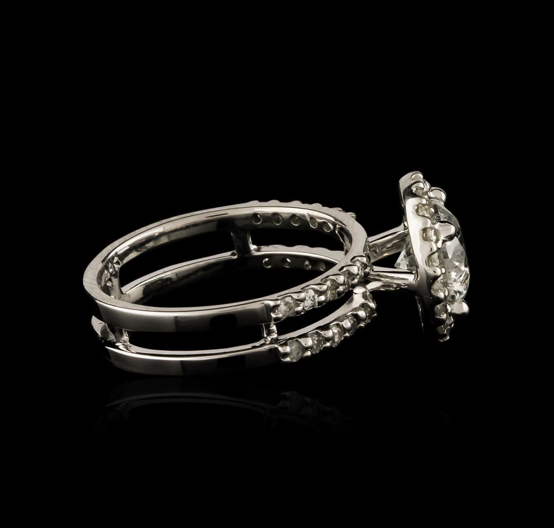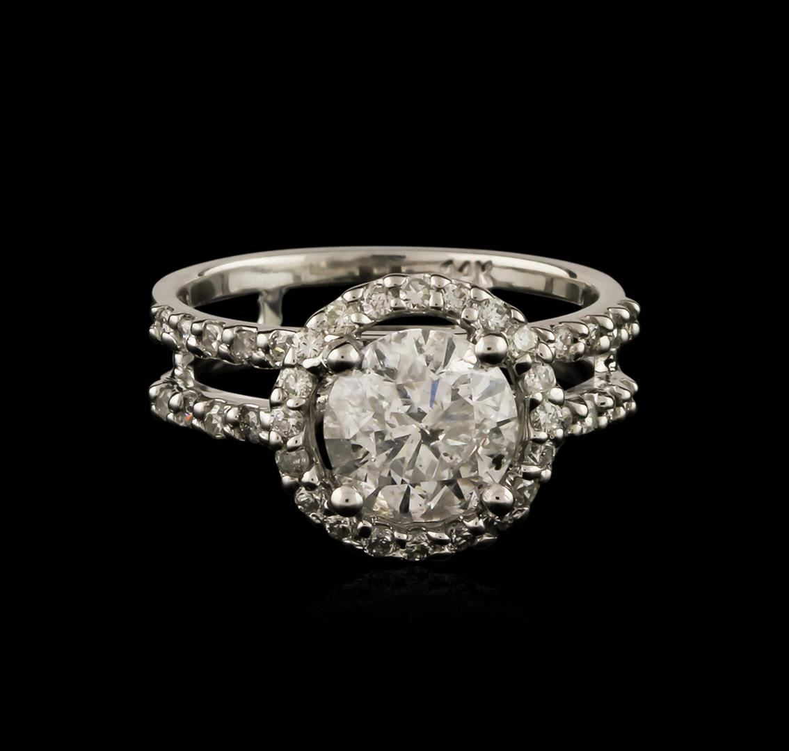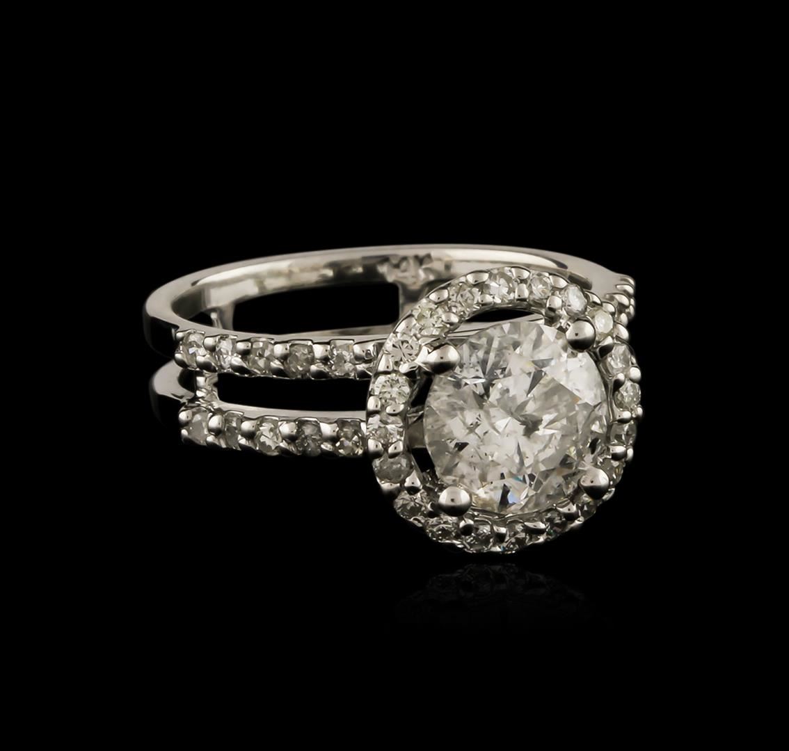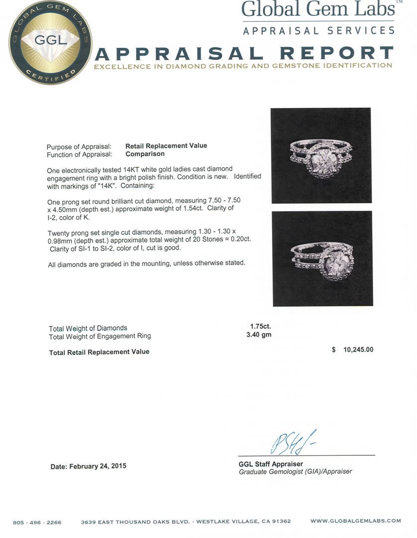 One electronically tested 14KT white gold ladies cast diamond engagement ring with a bright polish finish. Identified with markings of "14K". Condition is new. Containing: One prong set round brilliant cut diamond, measuring 7.50 - 7.50 x 4.50mm (depth est.) approximate weight of 1.54ct. Clarity: I-2. Color: K. Twenty prong set single cut diamonds, measuring 1.30 - 1.30 x 0.98mm (depth est.) approximate total weight of 20 Stones = 0.20ct. Clarity: SI-1 to SI-2. Color: I, Cut is Good. All diamonds are graded in the mounting, unless otherwise stated. Total Weight of Diamonds 1.75ct. Total Weight of Engagement Ring 3.40 grams. GGL Appraised at $10,245.00.