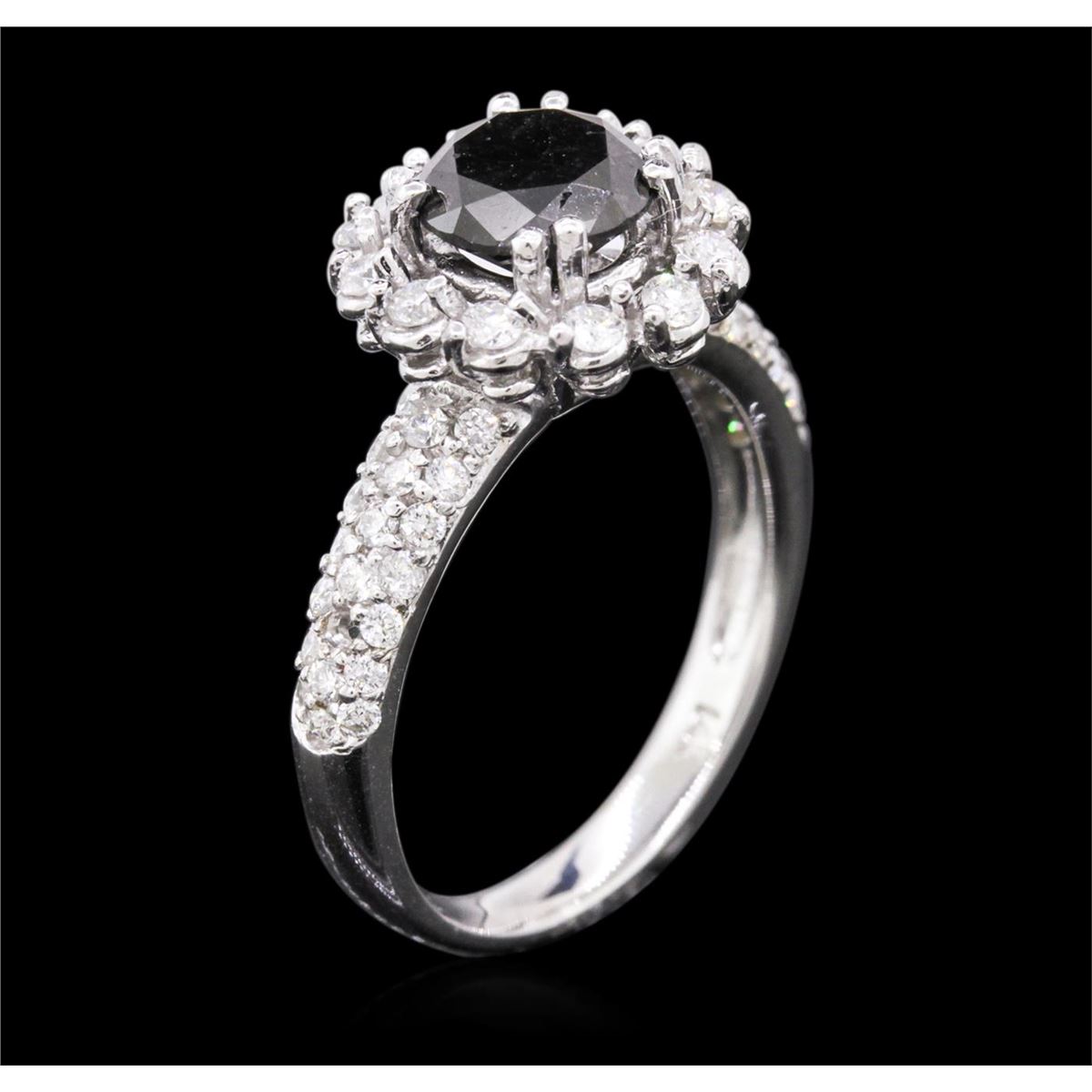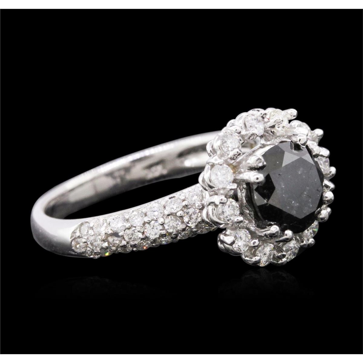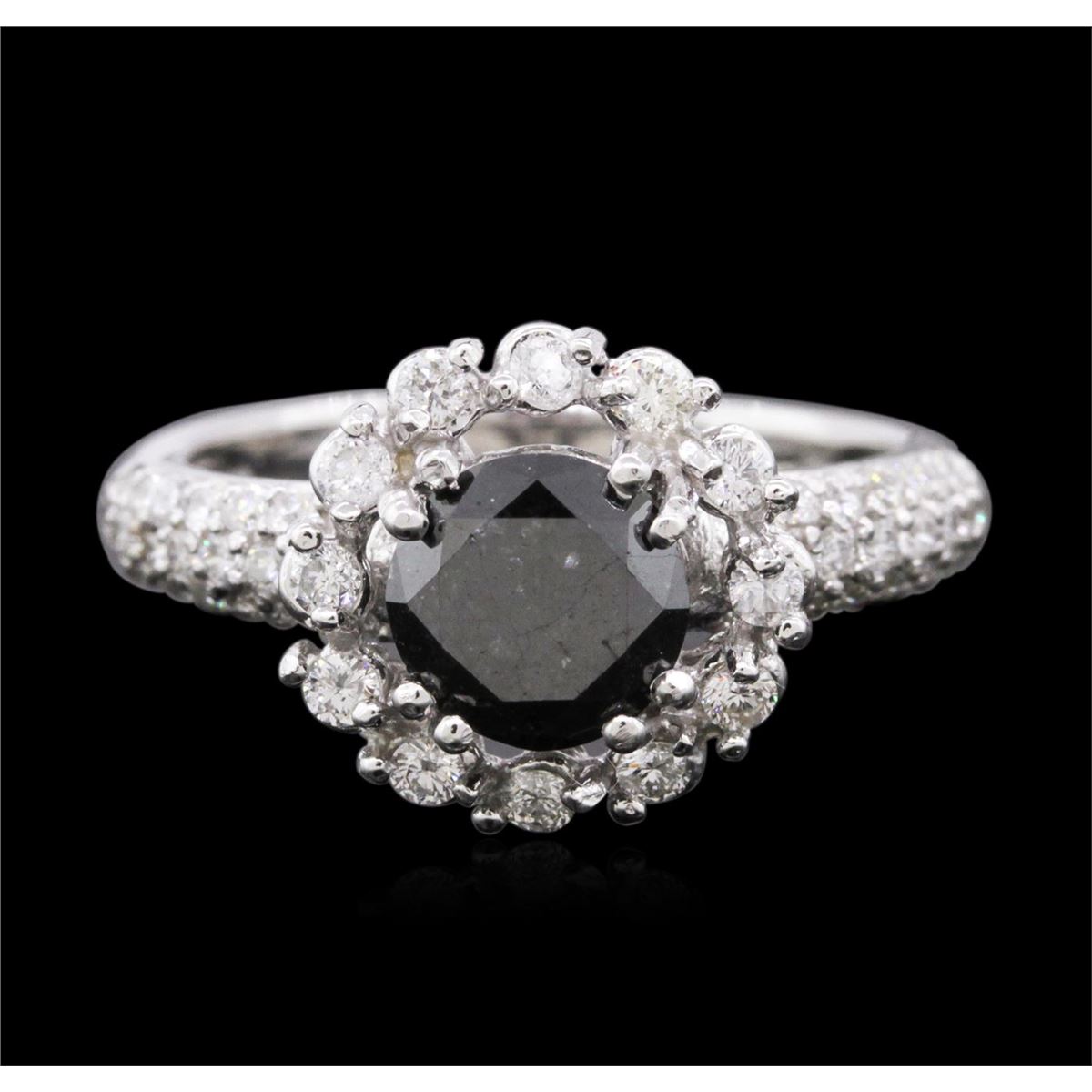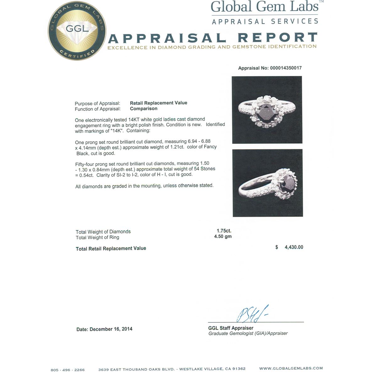 One electronically tested 14KT white gold ladies cast diamond engagement ring with a bright polish finish. Identified with markings of "14K". Condition is new. Containing: One prong set round brilliant cut diamond, measuring 6.94 - 6.88 x 4.14mm (depth est.) approximate weight of 1.21ct. Cut is Good. Fifty-Four prong set round brilliant cut diamonds, measuring 1.50 - 1.30 x 0.84mm (depth est.) approximate total weight of 54 Stones = 0.54ct. Clarity: SI-2 to I-2. Color: H - I, Cut is Good. All diamonds are graded in the mounting, unless otherwise stated. Total Weight of Diamonds 1.75ct. Total Weight of Ring 4.50 grams. GGL Appraised at $4,430.00.