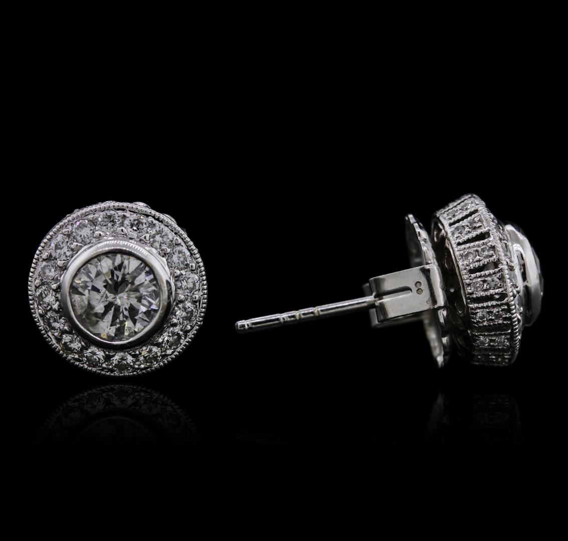 One pair electronically tested 14KT white gold ladies cast diamond earrings with friction posts with a bright polish finish. Identified with markings of "14K". Condition is new. Containing: Two bezel set round brilliant cut diamonds, measuring 5.50 - 5.50 x 3.30mm (depth est.) approximate total weight of 2 Stones = 1.22ct. Clarity: SI-2 to I-1. Color: I - J, Cut is Good. Ninety-Six prong set round brilliant cut diamonds, measuring 1.30 - 1.00 x 0.69mm (depth est.) approximate total weight of 96 Stones = 0.53ct. Clarity: SI-1 to SI-2. Color: I - J, Cut is Good. All diamonds are graded in the mounting, unless otherwise stated. Total Weight of Diamonds 1.75ct. Total Weight of Earrings 4.00 grams. GGL Appraised at $6,470.00.