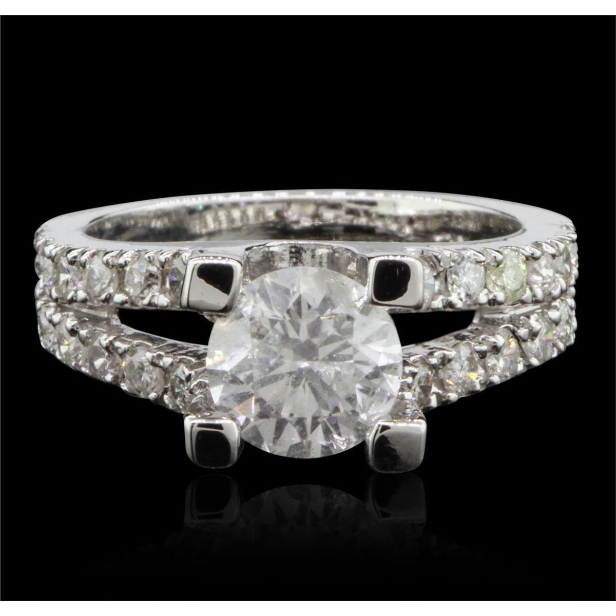 One electronically tested 14KT white gold Ladies combination cast & assembled engagement ring with a bright polish finish. Condition is excellent. Identified with markings of "14K". Containing: One prong set round brilliant cut diamond, measuring 6.90 - 6.70 x 4.08mm (depth est.) approximate weight of 1.15ct. Clarity of I-2, Color of G, Cut is Good. Twenty-Eight bead set round brilliant cut diamonds, measuring 1.80 - 1.80 x 1.08mm (depth est.) approximate total weight of 28 Stones = 0.60ct. Clarity of I-1 to I-2, Color of G - H, Cut is Good. Total Weight of Diamonds 1.75ct. Total Weight of Ring 5.10gm. GGL Appraised at $13,545.00.