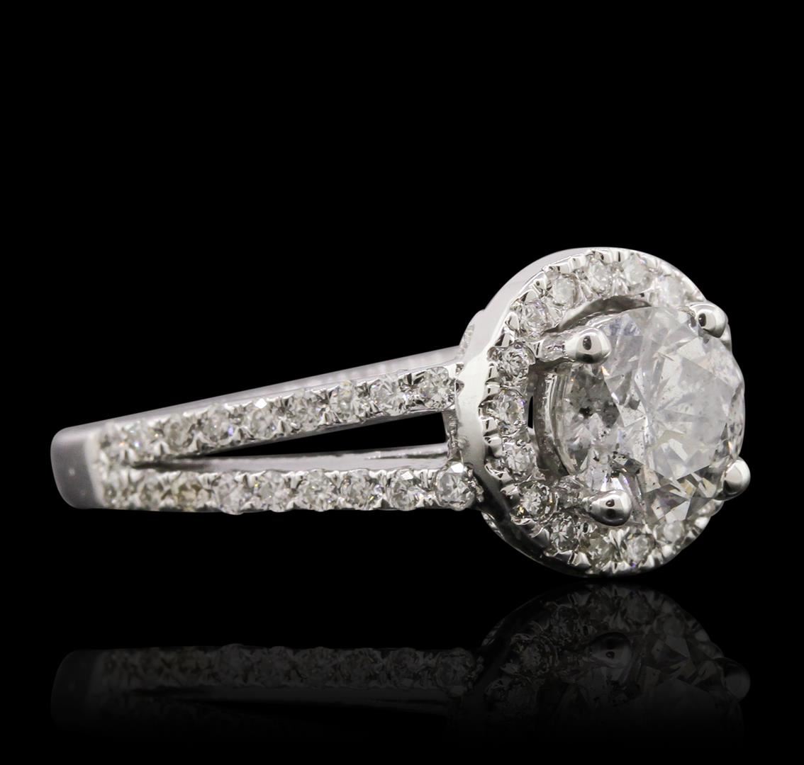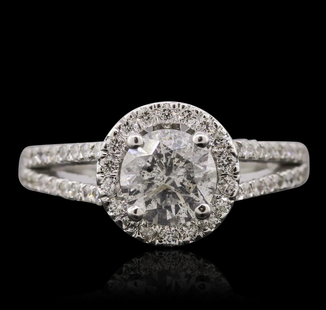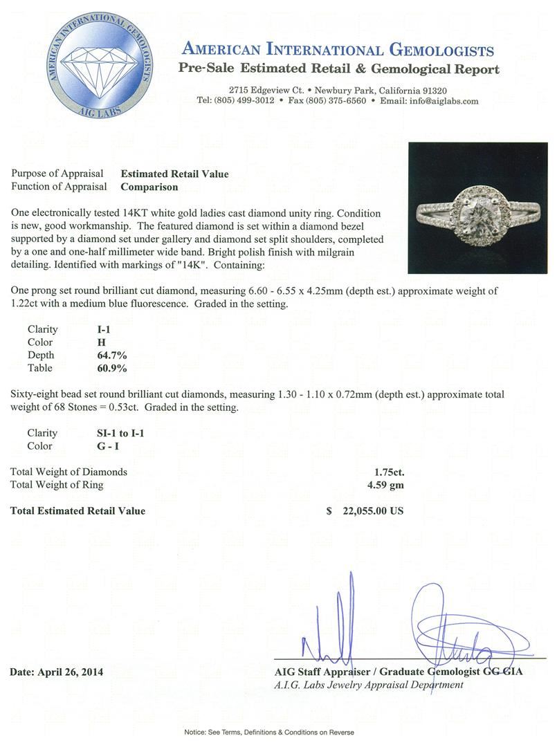 One electronically tested 14KT white gold ladies cast diamond unity ring. Condition is new, good workmanship. The featured diamond is set within a diamond bezel supported by a diamond set under gallery and diamond set split shoulders, completed by a one and one-half millimeter wide band. Bright polish finish with milgrain detailing. Identified with markings of "14K". Containing: One prong set round brilliant cut diamond, measuring 6.60 - 6.55 x 4.25mm (depth est.) approximate weight of 1.22ct with a medium blue fluorescence. Graded in the setting. Clarity: I-1 . Color: H Depth 64.7%. Table 60.9%. Sixty-Eight bead set round brilliant cut diamonds, measuring 1.30 - 1.10 x 0.72mm (depth est.) approximate. Total Weight of 68 Stones = 0.53ct. Graded in the setting. Clarity: SI-1 to I-1 . Color: G - I. Total Weight of Diamonds 1.75ct.. Total Weight of Ring 4.59 grams. AIG Appraised at $22,055.00.
