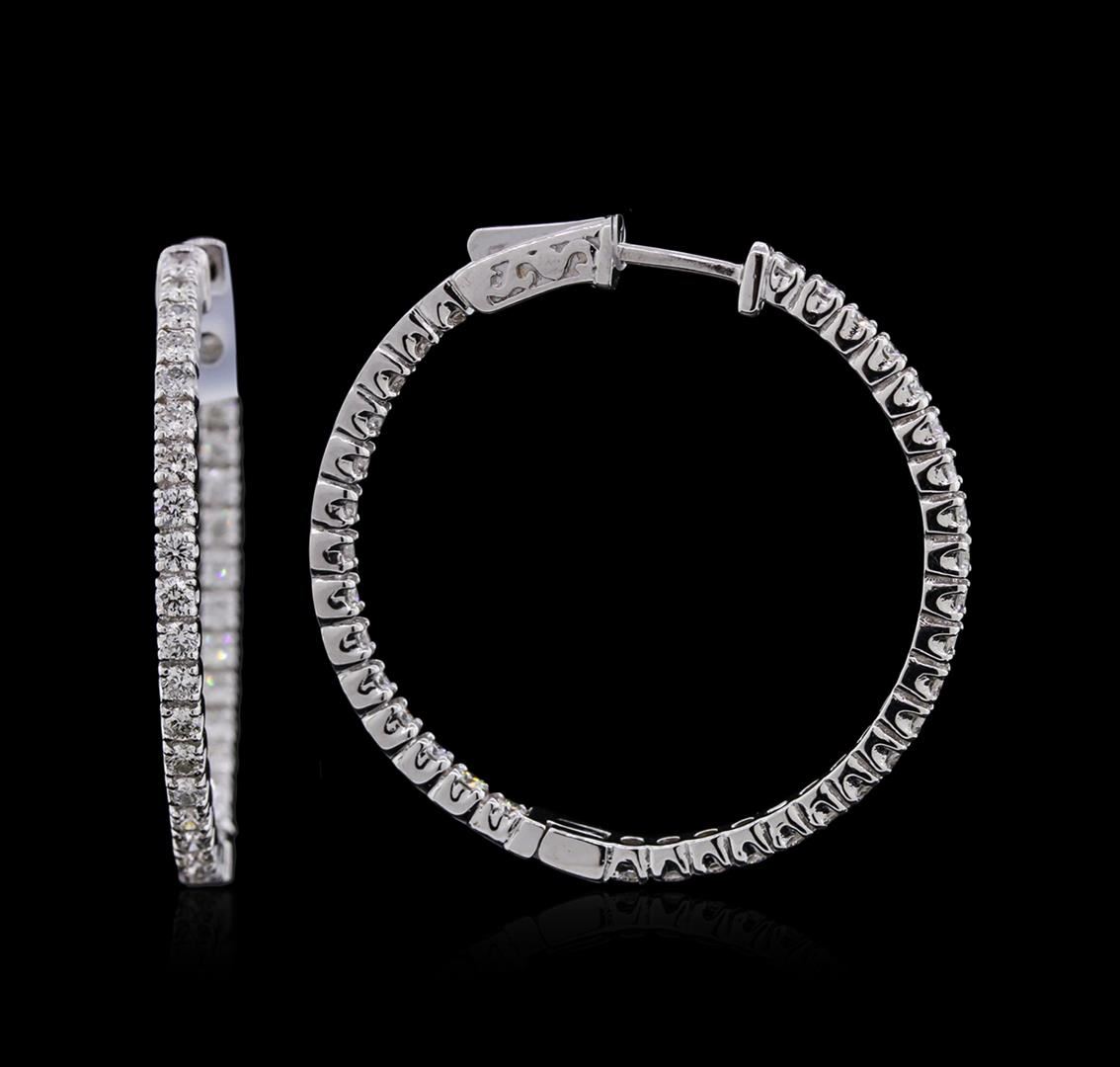 One electronically tested 14KT white gold ladies combination cast & assembled diamond hoop earrings with lever backs with a bright polish finish. Identified with markings of "14K". Condition is new. Containing: Seventy prong set round brilliant cut diamonds, measuring 1.90 - 1.90 x 1.14mm (depth est.) approximate total weight of 70 Stones = 1.76ct. Clarity: SI-1 to SI-2. Color: I - J, Cut is Good. Diamonds are graded in the mounting, unless otherwise stated. Total Weight of Diamonds 1.76ct. Total Weight of Hoop Earrings 8.70 grams. GGL Appraised at $4,090.00.