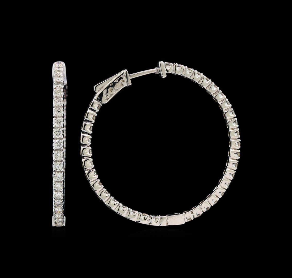 One electronically tested 14KT white gold ladies combination cast & assembled diamond hoop earrings with lever backs with a bright polish finish. Identified with markings of "14K". Condition is new. Containing: Seventy prong set round brilliant cut diamonds, measuring 1.90 - 1.90 x 1.14mm (depth est.) approximate total weight of 70 Stones = 1.76ct. Clarity: SI-1 to SI-2. Color: I - J, Cut is Good. Diamonds are graded in the mounting, unless otherwise stated. Total Weight of Diamonds 1.76ct. Total Weight of Hoop Earrings 8.70 grams. GGL Appraised at $4,090.00.