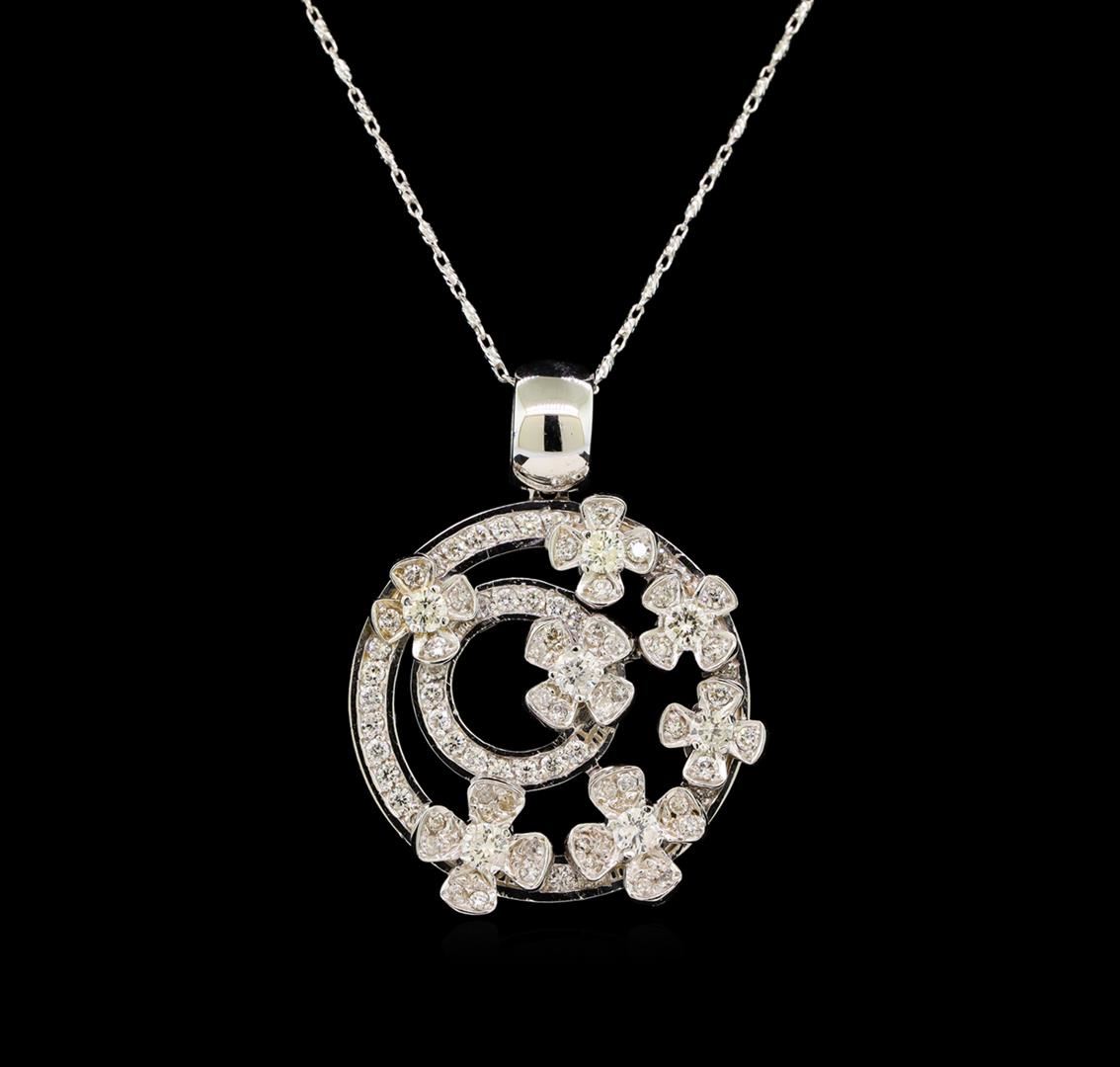 One electronically tested 14KT white gold ladies cast & assembled diamond pendant with chain. The pendant features two diamond set circles with diamond set floral accents, completed by a white gold bail. The pendant is supported by an eighteen inch length 14KT white gold designer style chain, terminating in a lobster claw clasp. Bright polish finish. Identified with markings of "14K". Condition is new, good workmanship. Containing: Seven prong set round brilliant cut diamonds, measuring 3.10 - 3.00 x 1.83mm (depth est.) approximate total weight of 7 Stones = 0.75ct. Graded in the setting. Clarity: SI-2 to I-1. Color: H - J Seventy-Four prong set round brilliant cut diamonds, measuring 1.60 - 1.40 x 0.90mm (depth est.) approximate total weight of 74 Stones = 1.01ct. Graded in the setting. Clarity: SI-1 to I-1. Color: G - I. Total Weight of Diamonds 1.76ct. Total Weight of Pendant With Chain 12.58 grams. AIG Appraised at $7,030.00.