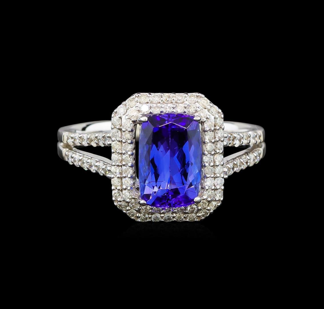 One electronically tested 14KT white gold ladies cast tanzanite and diamond ring with a bright polish finish. Identified with markings of "14K". Condition is new. Containing: One prong set rectangular cushion modified brilliant cut natural tanzanite, measuring 9.02 x 5.98 x 4.15mm, approximate weight of 1.76ct., clarity is eye clean, type I, medium light, very slightly grayish, violet color, (GIA V 4/3), cut is good. Eighty-Four prong set round brilliant cut diamonds, measuring 1.30 - 1.30 x 0.78mm (depth est.) approximate total weight of 84 Stones = 0.67ct. Clarity: SI-1 to SI-2. Color: I - J. Colored gemstones are presumed to have been subjected to commonly used enhancement processes. All diamonds and colored gemstones are graded in the mounting, unless otherwise stated. Total Weight of Colored Stones 1.76ct. Total Weight of Diamonds 0.67ct. Total Weight of Ring 4.00 grams. GGL Appraised at $3,815.00.