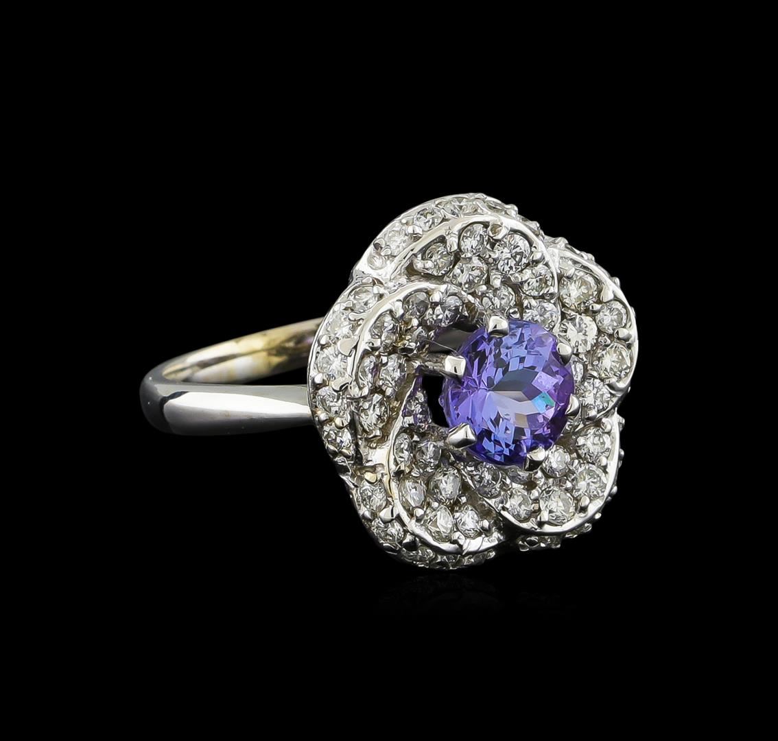 One electronically tested 14KT white gold ladies combination cast & assembled ring with a bright polish finish. Identified with markings of "14K". Condition is new. Containing: One prong set round modified brilliant cut natural tanzanite, measuring 7.17 - 7.06 x 5.10 mm, approximate weight of 1.76ct., clarity is eye clean, type I, medium light, very slightly grayish, violet color, (GIA V 4/3), cut is good. Sixty prong set round brilliant cut diamonds, measuring 2.00 - 1.50 x 1.05mm (depth est.) approximate total weight of 60 Stones = 1.18ct. Clarity: SI-1 to I-1. Color: I - J, Cut is Good. Colored gemstones are presumed to have been subjected to commonly used enhancement processes. All diamonds and colored gemstones are graded in the mounting, unless otherwise stated. Total Weight of Colored Stones 1.76ct. Total Weight of Diamonds 1.18ct. Total Weight of Ring 7.60 grams. GGL Appraised at $7,490.00.