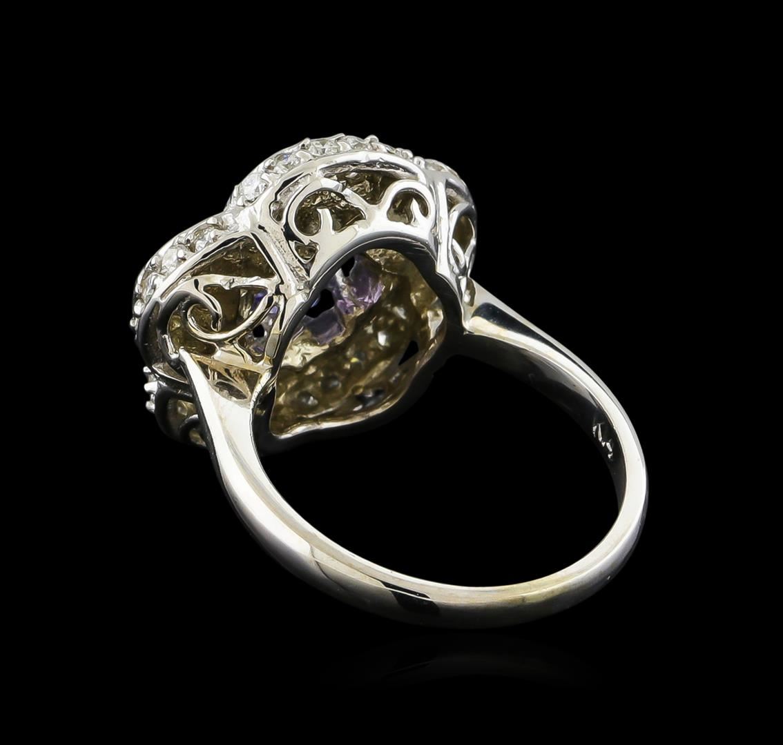 One electronically tested 14KT white gold ladies combination cast & assembled ring with a bright polish finish. Identified with markings of "14K". Condition is new. Containing: One prong set round modified brilliant cut natural tanzanite, measuring 7.17 - 7.06 x 5.10 mm, approximate weight of 1.76ct., clarity is eye clean, type I, medium light, very slightly grayish, violet color, (GIA V 4/3), cut is good. Sixty prong set round brilliant cut diamonds, measuring 2.00 - 1.50 x 1.05mm (depth est.) approximate total weight of 60 Stones = 1.18ct. Clarity: SI-1 to I-1. Color: I - J, Cut is Good. Colored gemstones are presumed to have been subjected to commonly used enhancement processes. All diamonds and colored gemstones are graded in the mounting, unless otherwise stated. Total Weight of Colored Stones 1.76ct. Total Weight of Diamonds 1.18ct. Total Weight of Ring 7.60 grams. GGL Appraised at $7,490.00.