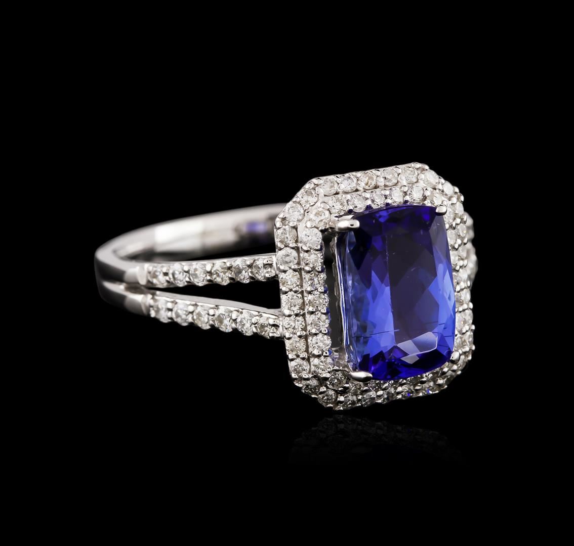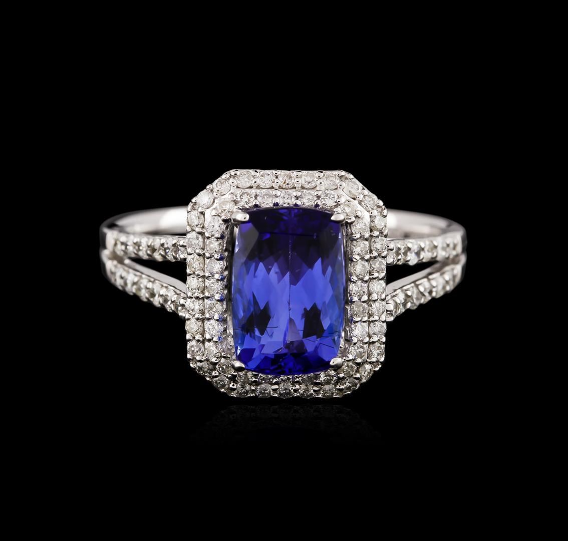 One electronically tested 14KT white gold ladies cast tanzanite and diamond ring with a bright polish finish. Identified with markings of "14K". Condition is new. Containing: One prong set rectangular cushion modified brilliant cut natural tanzanite, measuring 9.02 x 5.98 x 4.15mm, approximate weight of 1.76ct., clarity is eye clean, type I, medium light, very slightly grayish, violet color, (GIA V 4/3), cut is good. Eighty-Four prong set round brilliant cut diamonds, measuring 1.30 - 1.30 x 0.78mm (depth est.) approximate total weight of 84 Stones = 0.67ct. Clarity: SI-1 to SI-2. Color: I - J. Colored gemstones are presumed to have been subjected to commonly used enhancement processes. All diamonds and colored gemstones are graded in the mounting, unless otherwise stated. Total Weight of Colored Stones 1.76ct. Total Weight of Diamonds 0.67ct. Total Weight of Ring 4.00 grams. GGL Appraised at $3,815.00.