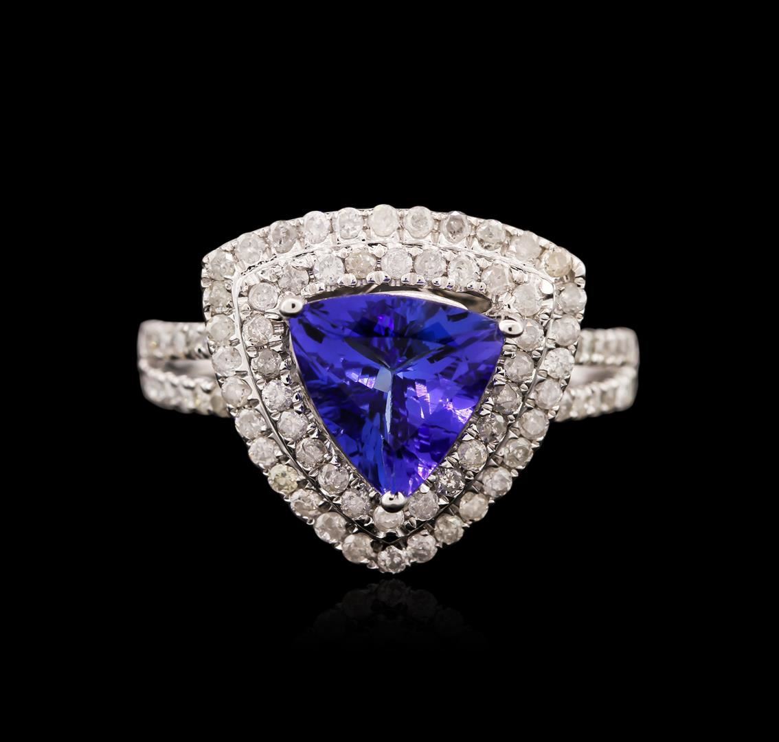 One electronically tested 14KT white gold ladies cast tanzanite and diamond ring with a bright polish finish. Identified with markings of "14K". Condition is new. Containing: One prong set triangle modified brilliant cut natural tanzanite, measuring 7.84 x 7.95 x 4.68mm, approximate weight of 1.76ct., clarity is eye clean, type I, medium light, very slightly grayish, violet color, (GIA V 4/3), cut is good. Eighty prong set round brilliant cut diamonds, measuring 1.10 - 1.10 x 0.66mm (depth est.) approximate total weight of 80 Stones = 0.38ct. Clarity: I-1 to I-2. Color: I - J. Colored gemstones are presumed to have been subjected to commonly used enhancement processes. All diamonds and colored gemstones are graded in the mounting, unless otherwise stated. Total Weight of Colored Stones 1.76ct. Total Weight of Diamonds 0.38ct. Total Weight of Ring 4.70 grams. GGL Appraised at $3,305.00.