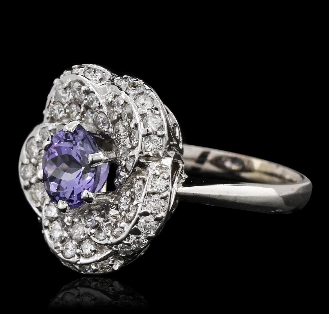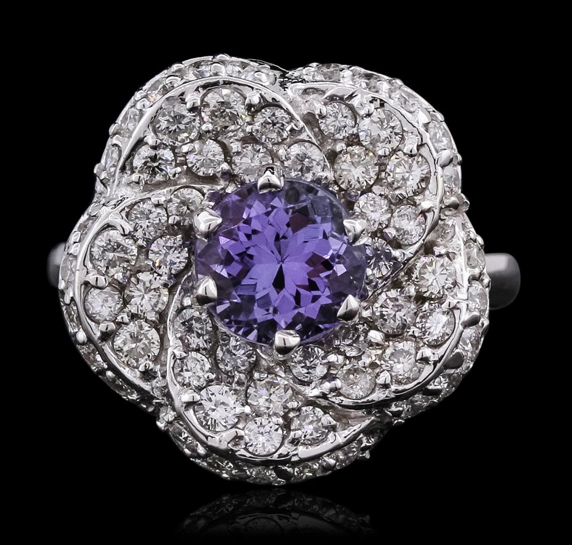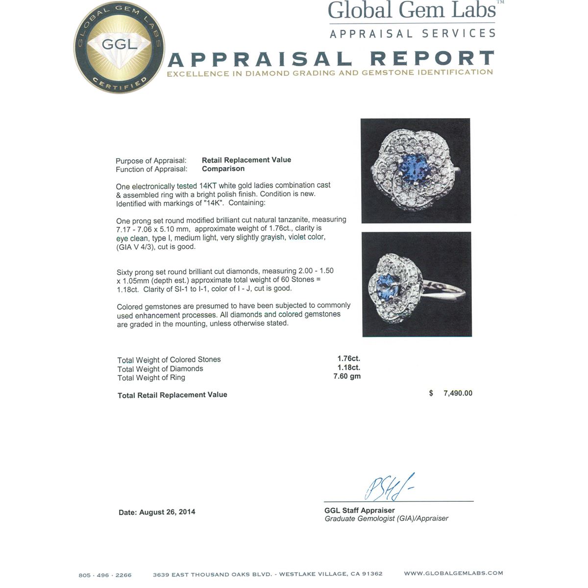 One electronically tested 14KT white gold ladies combination cast & assembled ring with a bright polish finish. Identified with markings of "14K". Condition is new. Containing: One prong set round modified brilliant cut natural tanzanite, measuring 7.17 - 7.06 x 5.10 mm, approximate weight of 1.76ct., clarity is eye clean, type I, medium light, very slightly grayish, violet color, (GIA V 4/3), cut is good. Sixty prong set round brilliant cut diamonds, measuring 2.00 - 1.50 x 1.05mm (depth est.) approximate total weight of 60 Stones = 1.18ct. Clarity: SI-1 to I-1. Color: I - J, Cut is Good. Colored gemstones are presumed to have been subjected to commonly used enhancement processes. All diamonds and colored gemstones are graded in the mounting, unless otherwise stated. Total Weight of Colored Stones 1.76ct. Total Weight of Diamonds 1.18ct. Total Weight of Ring 7.60 grams. GGL Appraised at $7,490.00.