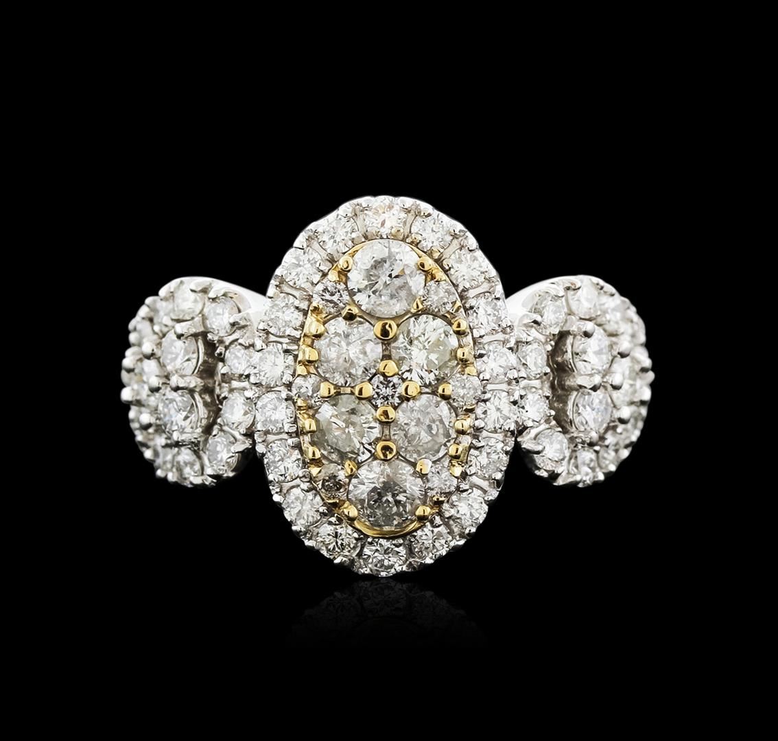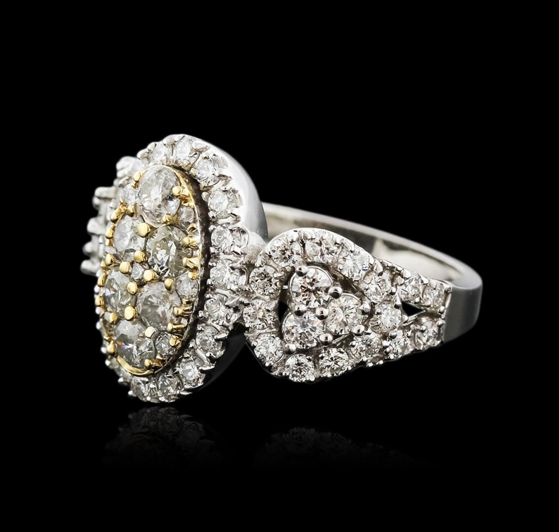 One electronically tested 14KT white gold ladies cast diamond ring with a bright polish finish. Identified with markings of "14K". Condition is new. Containing: Six prong set round brilliant cut diamonds, measuring 3.20 - 3.20 x 1.92mm (depth est.) approximate total weight of 6 Stones = 0.72ct. Clarity: I-1 to I-2. Color: J - K, Cut is Good. Fifty-Three prong set round brilliant cut diamonds, measuring 2.30 - 1.20 x 1.05mm (depth est.) approximate total weight of 53 Stones = 1.04ct. Clarity: SI-1 to I-1. Color: I - J, Cut is Good. All diamonds are graded in the mounting, unless otherwise stated. Total Weight of Diamonds 1.76ct. Total Weight of Ring 6.30 grams. GGL Appraised at $4,910.00.