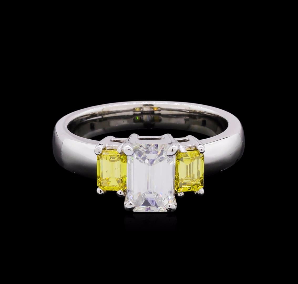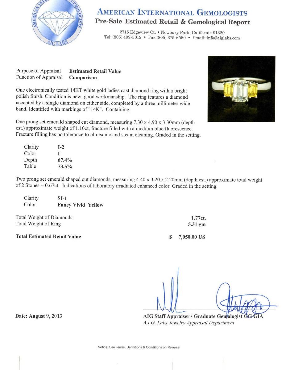 One electronically tested 14KT white gold ladies cast diamond ring with a bright polish finish. Condition is new, good workmanship. The ring features a diamond accented by a single diamond on either side, completed by a three millimeter wide band. Identified with markings of "14K". Containing: One prong set emerald shaped cut diamond, measuring 7.30 x 4.90 x 3.30mm (depth est.) approximate weight of 1.10ct, fracture filled with a medium blue fluorescence. Fracture filling has no tolerance to ultrasonic and steam cleaning. Graded in the setting. Clarity I-2. Color I. Depth 67.4%. Table 73.5%. Two prong set emerald shaped cut diamonds, measuring 4.40 x 3.20 x 2.20mm (depth est.) approximate total weight of 2 Stones = 0.67ct. Indications of laboratory irradiated enhanced color. Graded in the setting. Clarity SI-1. Color Fancy Vivid Yellow. Total Weight of Diamonds 1.77ct. Total Weight of Ring 5.31gm. AIG Appraised at $7,050.00.