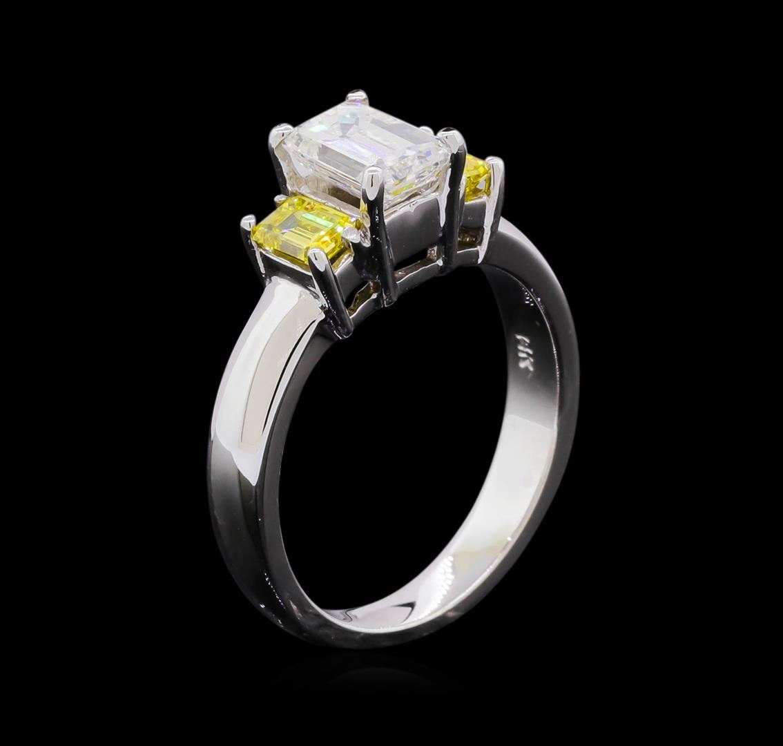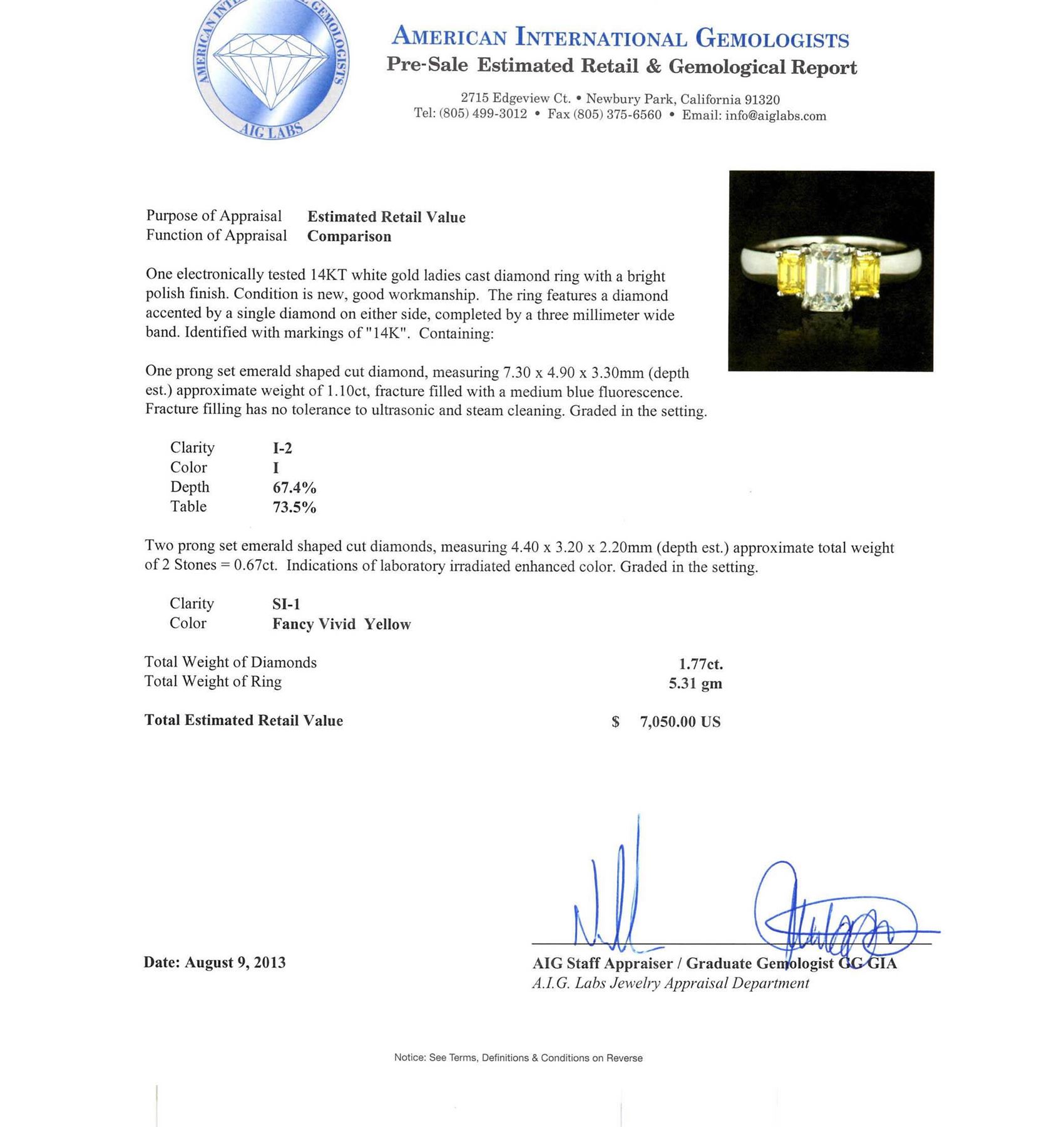 One electronically tested 14KT white gold ladies cast diamond ring with a bright polish finish. Condition is new, good workmanship. The ring features a diamond accented by a single diamond on either side, completed by a three millimeter wide band. Identified with markings of "14K". Containing: One prong set emerald shaped cut diamond, measuring 7.30 x 4.90 x 3.30mm (depth est.) approximate weight of 1.10ct, fracture filled with a medium blue fluorescence. Fracture filling has no tolerance to ultrasonic and steam cleaning. Graded in the setting. Clarity I-2. Color I. Depth 67.4%. Table 73.5%. Two prong set emerald shaped cut diamonds, measuring 4.40 x 3.20 x 2.20mm (depth est.) approximate total weight of 2 Stones = 0.67ct. Indications of laboratory irradiated enhanced color. Graded in the setting. Clarity SI-1. Color Fancy Vivid Yellow. Total Weight of Diamonds 1.77ct. Total Weight of Ring 5.31gm. AIG Appraised at $7,050.00.