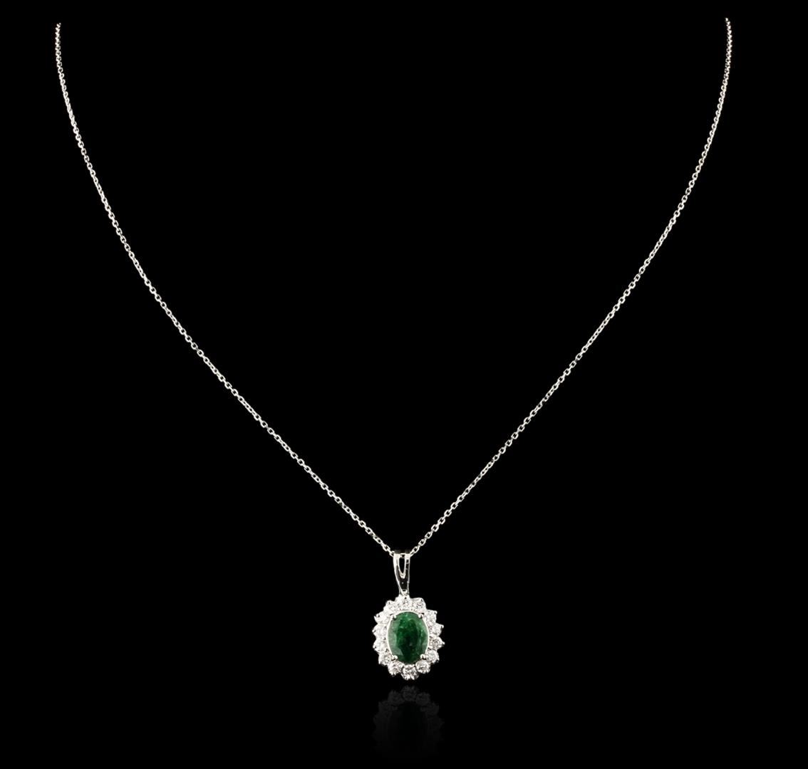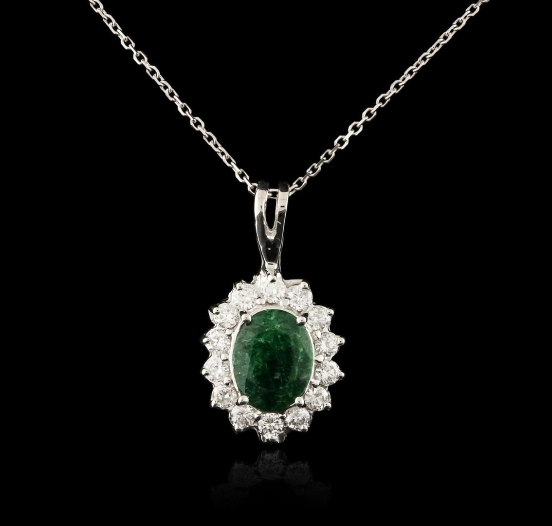 One pendant with chain featuring: 14KT white gold weighing 2.72 grams containing one emerald with a total weight of 1.77ct and prong set round diamonds with a total weight of 0.62ct.