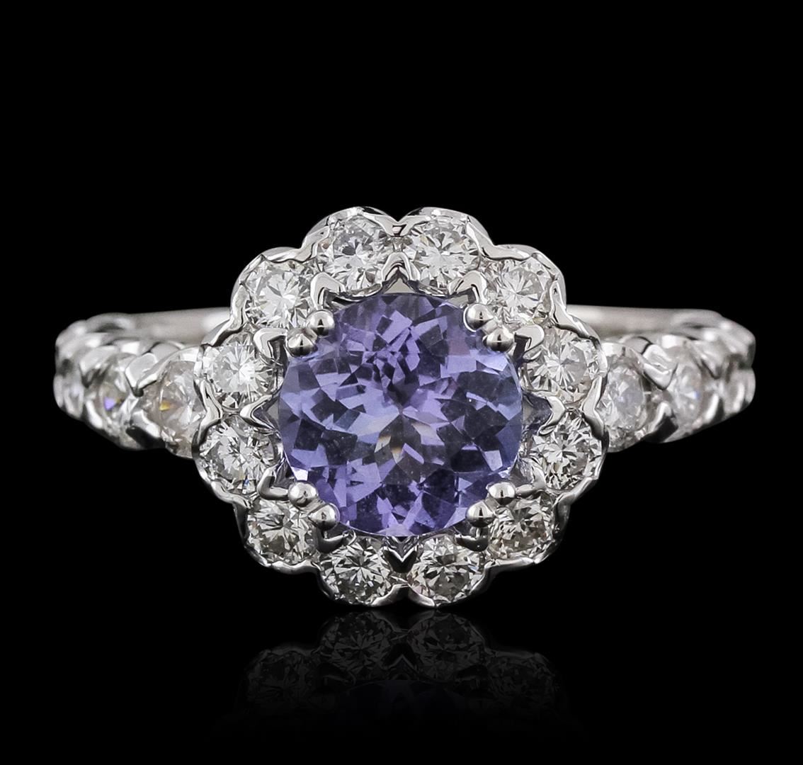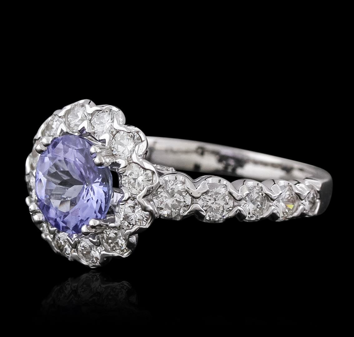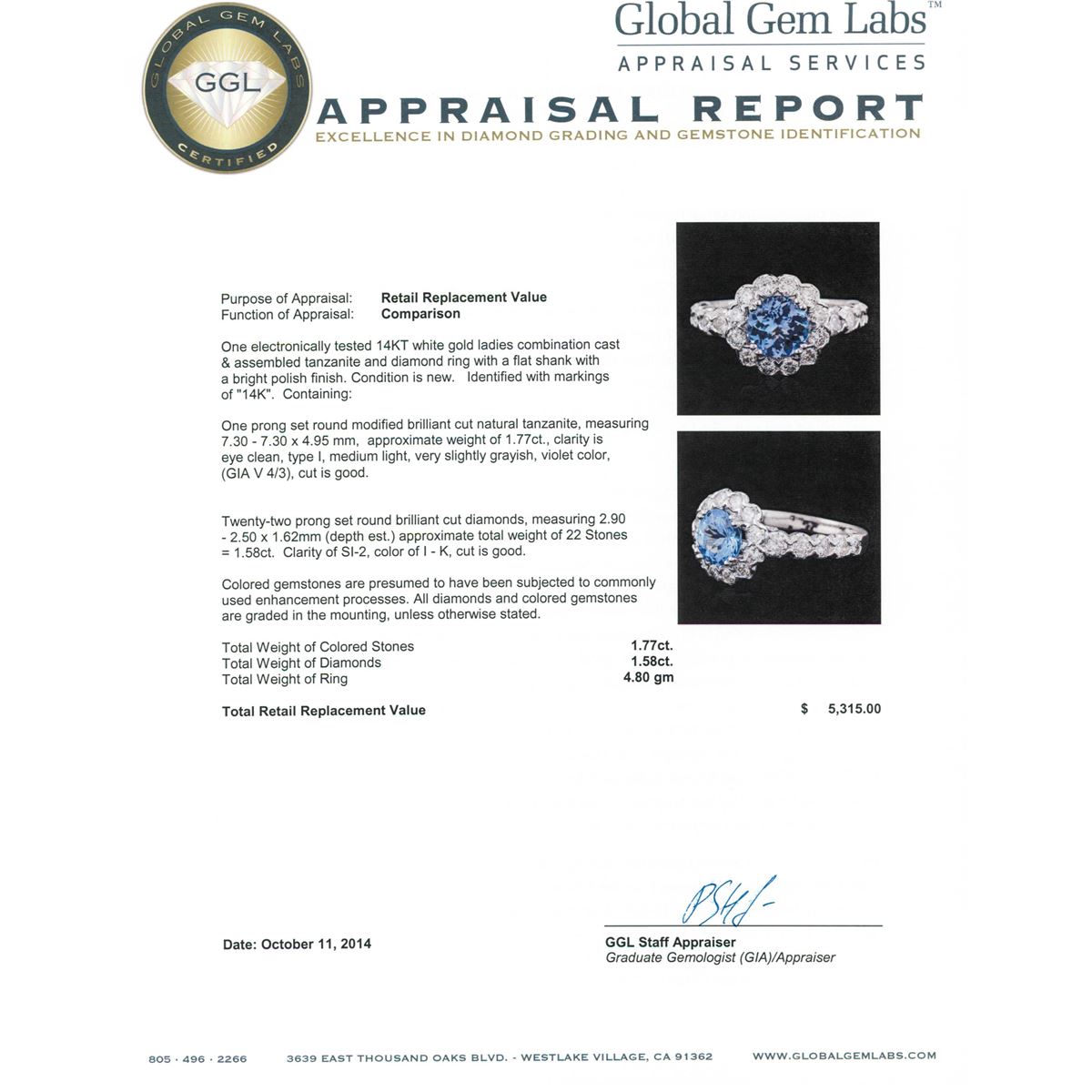 One electronically tested 14KT white gold ladies combination cast & assembled tanzanite and diamond ring with a flat shank with a bright polish finish. Identified with markings of "14K". Condition is new. Containing: One prong set round modified brilliant cut natural tanzanite, measuring 7.30 - 7.30 x 4.95 mm, approximate weight of 1.77ct., clarity is eye clean, type I, medium light, very slightly grayish, violet color, (GIA V 4/3), cut is good. Twenty-Two prong set round brilliant cut diamonds, measuring 2.90 - 2.50 x 1.62mm (depth est.) approximate total weight of 22 Stones = 1.58ct. Clarity: SI-2. Color: I - K, Cut is Good. Colored gemstones are presumed to have been subjected to commonly used enhancement processes. All diamonds and colored gemstones are graded in the mounting, unless otherwise stated. Total Weight of Colored Stones 1.77ct. Total Weight of Diamonds 1.58ct. Total Weight of Ring 4.80 grams. GGL Appraised at $5,315.00.