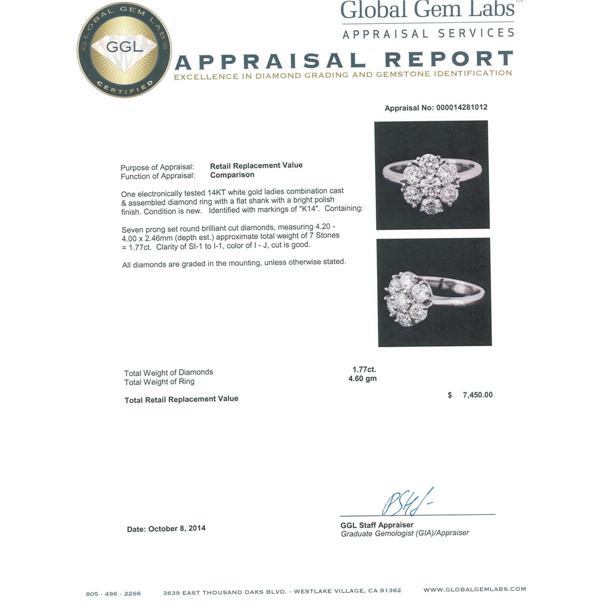One electronically tested 14KT white gold ladies combination cast & assembled diamond ring with a flat shank with a bright polish finish. Identified with markings of "K14". Condition is new. Containing: Seven prong set round brilliant cut diamonds, measuring 4.20 - 4.00 x 2.46mm (depth est.) approximate total weight of 7 Stones = 1.77ct. Clarity: SI-1 to I-1. Color: I - J, Cut is Good. All diamonds are graded in the mounting, unless otherwise stated. Total Weight of Diamonds 1.77ct. Total Weight of Ring 4.60 grams. GGL Appraised at $7,450.00.
