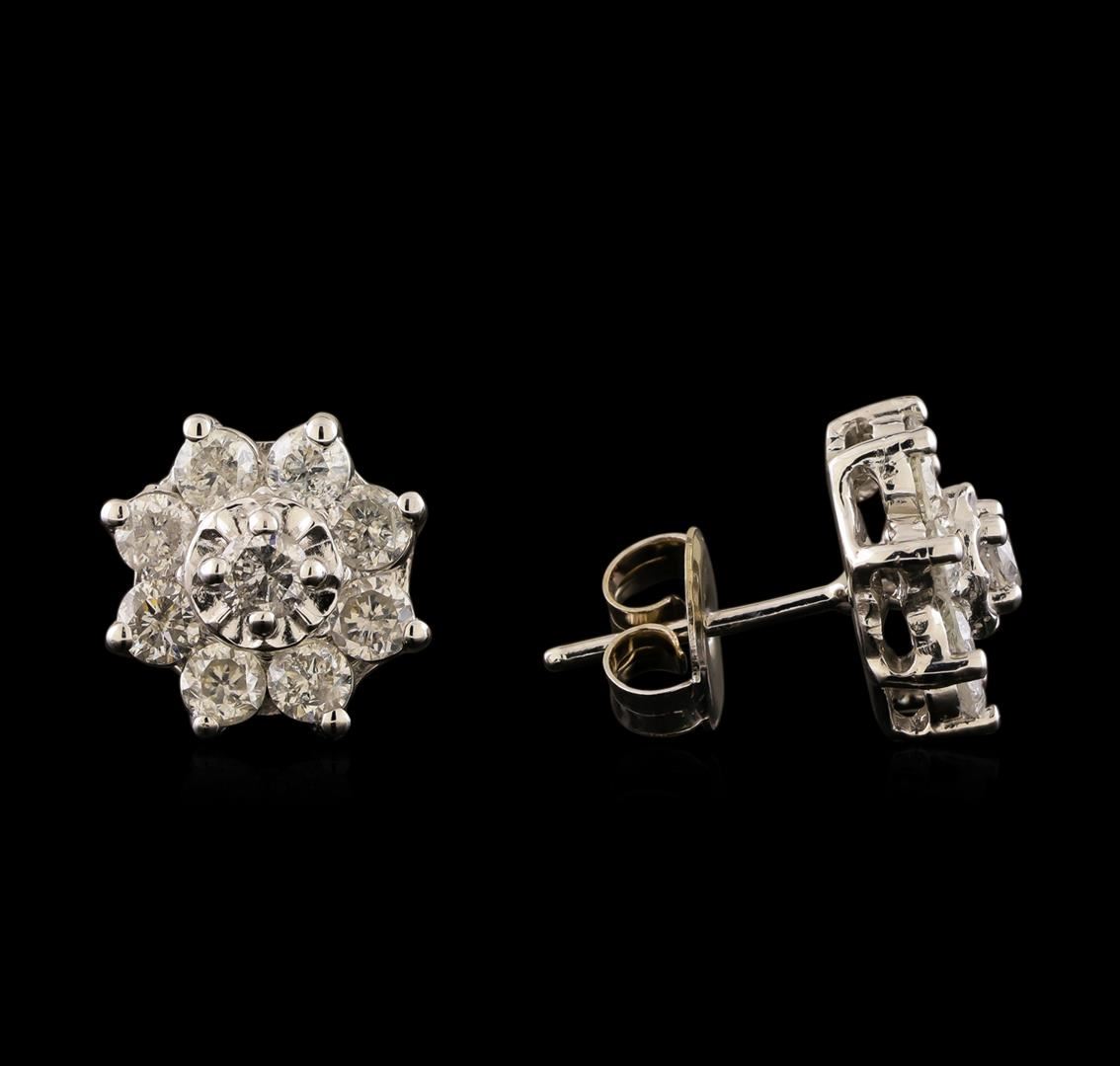 One pair electronically tested 14KT white gold ladies combination cast & assembled diamond earrings with friction posts with a bright polish finish. Condition is new. Containing: Eighteen prong set round brilliant cut diamonds, measuring 3.00 - 3.00 x 1.80mm (depth est.) approximate total weight of 18 Stones = 1.78ct. Clarity: I-2 to I-3. Color: I - J, Cut is Good. All diamonds are graded in the mounting, unless otherwise stated. Total Weight of Diamonds 1.78ct. Total Weight of Earrings 4.80 grams. GGL Appraised at $4,745.00.