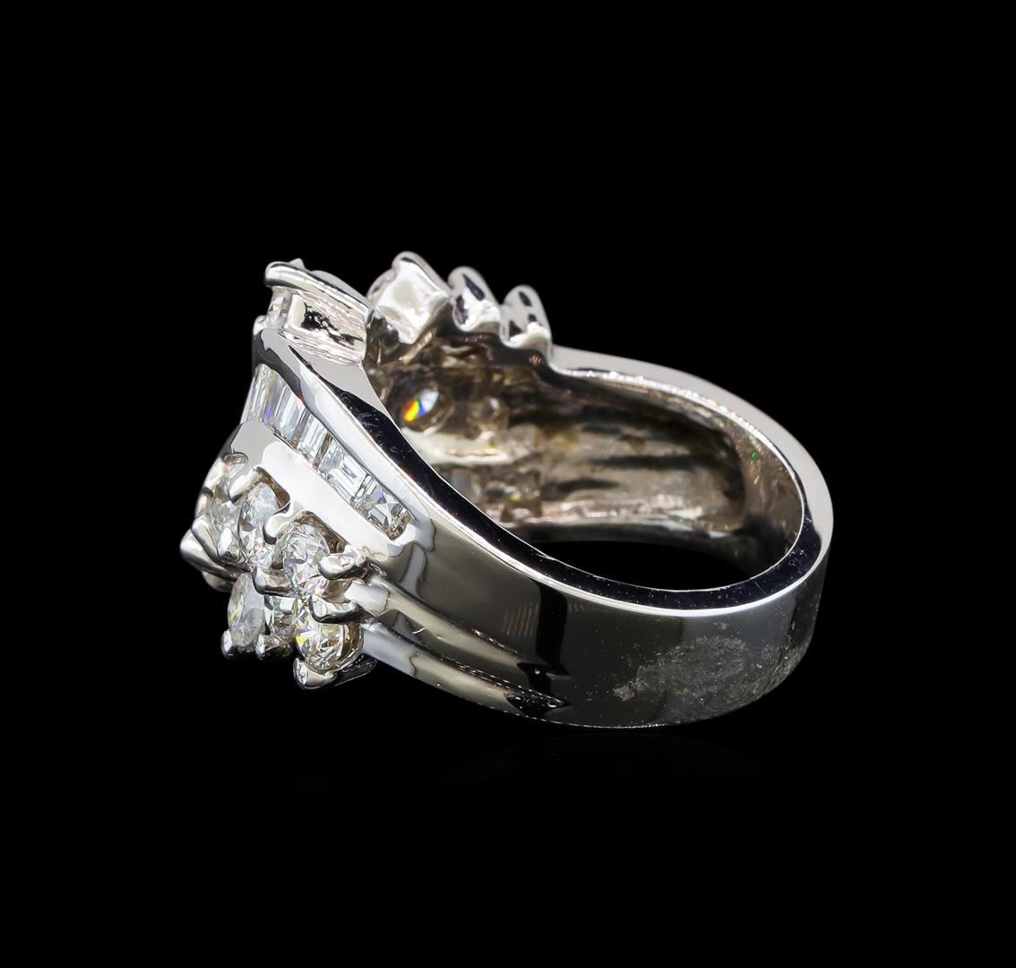 One electronically tested 14KT white gold ladies cast diamond ring with a bright polish finish. Identified with markings of "14K". Condition is new. Containing: Eighteen channel set baguette cut diamonds, measuring from 1.30 x 1.30 x 1.11mm (depth est.) to 2.80 x 1.50 x 1.28mm (depth est.) approximate total weight of 18 Stones = 0.56ct. Clarity: VS-1. Color: H - I, Cut is Good. Sixteen prong set round brilliant cut diamonds, measuring 3.00 - 2.50 x 1.65mm (depth est.) approximate total weight of 16 Stones = 1.22ct. Clarity: SI-1 to I-1. Color: I - J, Cut is Good. All diamonds are graded in the mounting, unless otherwise stated. Total Weight of Diamonds 1.78ct. Total Weight of Ring 9.10 grams. GGL Appraised at $5,285.00.