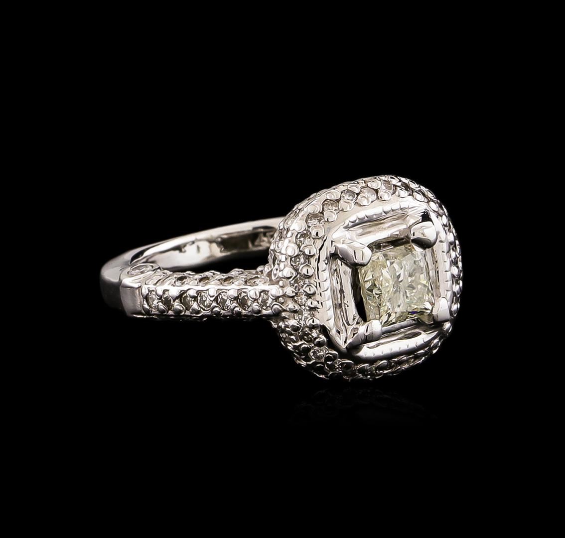 One electronically tested 14KT white gold ladies cast diamond unity ring. Condition is new, good workmanship. The featured diamond is set within a tiered diamond bezel supported by diamond set shoulders, completed by a two and one-half millimeter wide band. Bright polish finish with milgrain detailing. Identified with markings of "14K". Containing: One prong set princess cut diamond, measuring 4.75 x 4.70 x 4.00mm (depth est.), 8.00.%. GTCF approximate weight of 0.88ct with a strong blue fluorescence. Graded in the setting. Clarity: I-2. Color: 85.1%. Table 74.5%. One Hundred Fourteen bead & bezel set round brilliant cut diamonds, measuring 1.80 - 1.00 x 0.84mm (depth est.) approximate. Total Weight of 114 Stones = 0.90ct. Graded in the setting. Clarity: VS-2 to SI-2. Color: G - I. Total Weight of Diamonds 1.78ct. Total Weight of Ring 9.34 grams. AIG Appraised at $8,925.00.