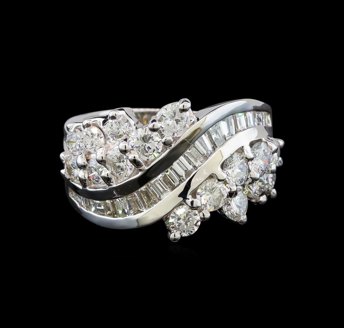 One electronically tested 14KT white gold ladies cast diamond ring with a bright polish finish. Identified with markings of "14K". Condition is new. Containing: Eighteen channel set baguette cut diamonds, measuring from 1.30 x 1.30 x 1.11mm (depth est.) to 2.80 x 1.50 x 1.28mm (depth est.) approximate total weight of 18 Stones = 0.56ct. Clarity: VS-1. Color: H - I, Cut is Good. Sixteen prong set round brilliant cut diamonds, measuring 3.00 - 2.50 x 1.65mm (depth est.) approximate total weight of 16 Stones = 1.22ct. Clarity: SI-1 to I-1. Color: I - J, Cut is Good. All diamonds are graded in the mounting, unless otherwise stated. Total Weight of Diamonds 1.78ct. Total Weight of Ring 9.10 grams. GGL Appraised at $5,285.00.