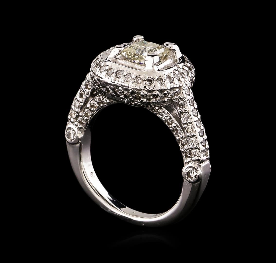 One electronically tested 14KT white gold ladies cast diamond unity ring. Condition is new, good workmanship. The featured diamond is set within a tiered diamond bezel supported by diamond set shoulders, completed by a two and one-half millimeter wide band. Bright polish finish with milgrain detailing. Identified with markings of "14K". Containing: One prong set princess cut diamond, measuring 4.75 x 4.70 x 4.00mm (depth est.), 8.00.%. GTCF approximate weight of 0.88ct with a strong blue fluorescence. Graded in the setting. Clarity: I-2. Color: 85.1%. Table 74.5%. One Hundred Fourteen bead & bezel set round brilliant cut diamonds, measuring 1.80 - 1.00 x 0.84mm (depth est.) approximate. Total Weight of 114 Stones = 0.90ct. Graded in the setting. Clarity: VS-2 to SI-2. Color: G - I. Total Weight of Diamonds 1.78ct. Total Weight of Ring 9.34 grams. AIG Appraised at $8,925.00.