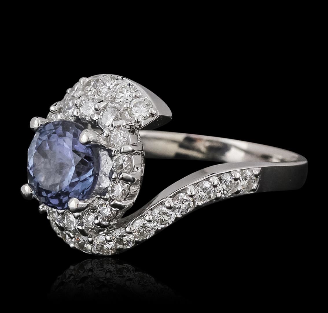 One electronically tested 14KT white gold ladies combination cast & assembled tanzanite and diamond ring with a flat shank with a bright polish finish. Identified with markings of "14K". Condition is new. Containing: One prong set round modified brilliant cut natural tanzanite, measuring 7.31 - 7.31 x 4.96 mm, approximate weight of 1.78ct., clarity is eye clean, type I, medium light, very slightly grayish, violet color, (GIA V 4/3), cut is good. Thirty-Six prong set round brilliant cut diamonds, measuring 1.80 - 1.80 x 1.08mm (depth est.) approximate total weight of 36 Stones = 0.77ct. Clarity: SI-1 to I-1. Color: I - J, Cut is Good. Colored gemstones are presumed to have been subjected to commonly used enhancement processes. All diamonds and colored gemstones are graded in the mounting, unless otherwise stated. Total Weight of Colored Stones 1.78ct. Total Weight of Diamonds 0.77ct. Total Weight of Ring 5.90 grams. GGL Appraised at $4,670.00.