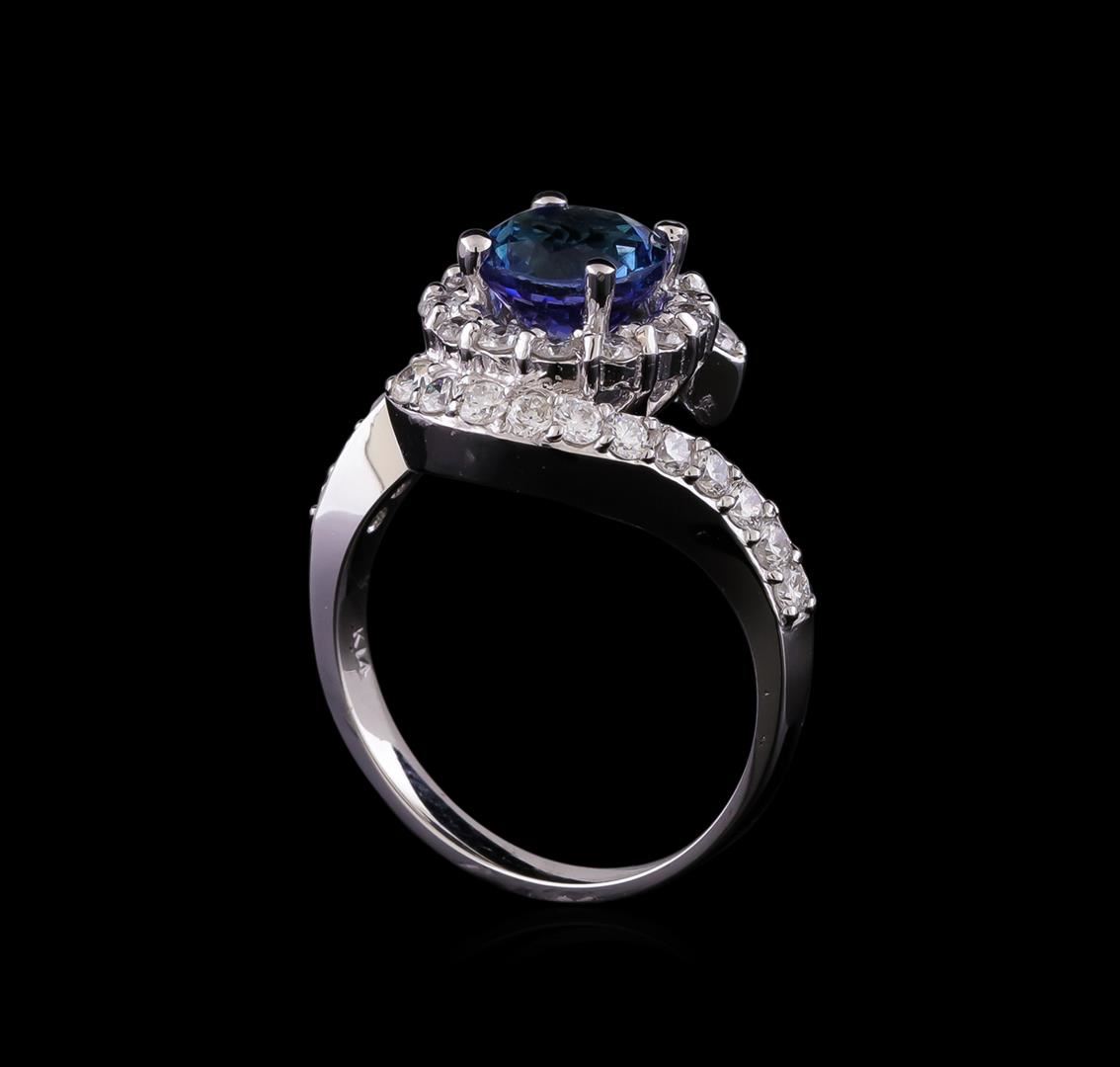 One electronically tested 14KT white gold ladies combination cast & assembled tanzanite and diamond ring with a flat shank with a bright polish finish. Identified with markings of "14K". Condition is new. Containing: One prong set round modified brilliant cut natural tanzanite, measuring 7.31 - 7.31 x 4.96 mm, approximate weight of 1.78ct., clarity is eye clean, type I, medium light, very slightly grayish, violet color, (GIA V 4/3), cut is good. Thirty-Six prong set round brilliant cut diamonds, measuring 1.80 - 1.80 x 1.08mm (depth est.) approximate total weight of 36 Stones = 0.77ct. Clarity: SI-1 to I-1. Color: I - J, Cut is Good. Colored gemstones are presumed to have been subjected to commonly used enhancement processes. All diamonds and colored gemstones are graded in the mounting, unless otherwise stated. Total Weight of Colored Stones 1.78ct. Total Weight of Diamonds 0.77ct. Total Weight of Ring 5.90 grams. GGL Appraised at $4,670.00.