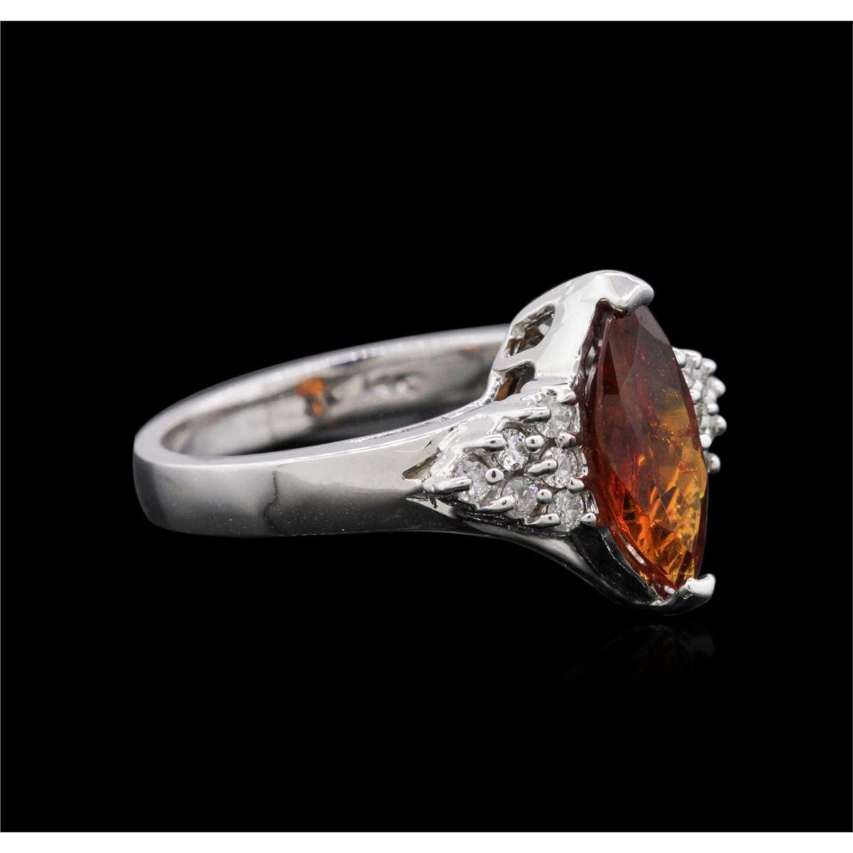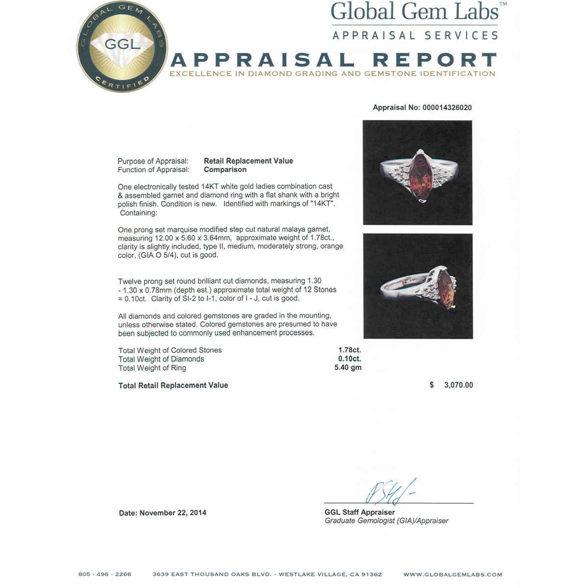 One electronically tested 14KT white gold ladies combination cast & assembled garnet and diamond ring with a flat shank with a bright polish finish. Identified with markings of "14KT". Condition is new. Containing: One prong set marquise modified step cut natural malaya garnet, measuring 12.00 x 5.60 x 3.64mm, approximate weight of 1.78ct., clarity is slightly included, type II, medium, moderately strong, orange color, (GIA O 5/4), cut is good. Twelve prong set round brilliant cut diamonds, measuring 1.30 - 1.30 x 0.78mm (depth est.) approximate total weight of 12 Stones = 0.10ct. Clarity: SI-2 to I-1. Color: I - J, Cut is Good. All diamonds and colored gemstones are graded in the mounting, unless otherwise stated. Colored gemstones are presumed to have been subjected to commonly used enhancement processes. Total Weight of Colored Stones 1.78ct. Total Weight of Diamonds 0.10ct. Total Weight of Ring 5.40 grams. GGL Appraised at $3,070.00.