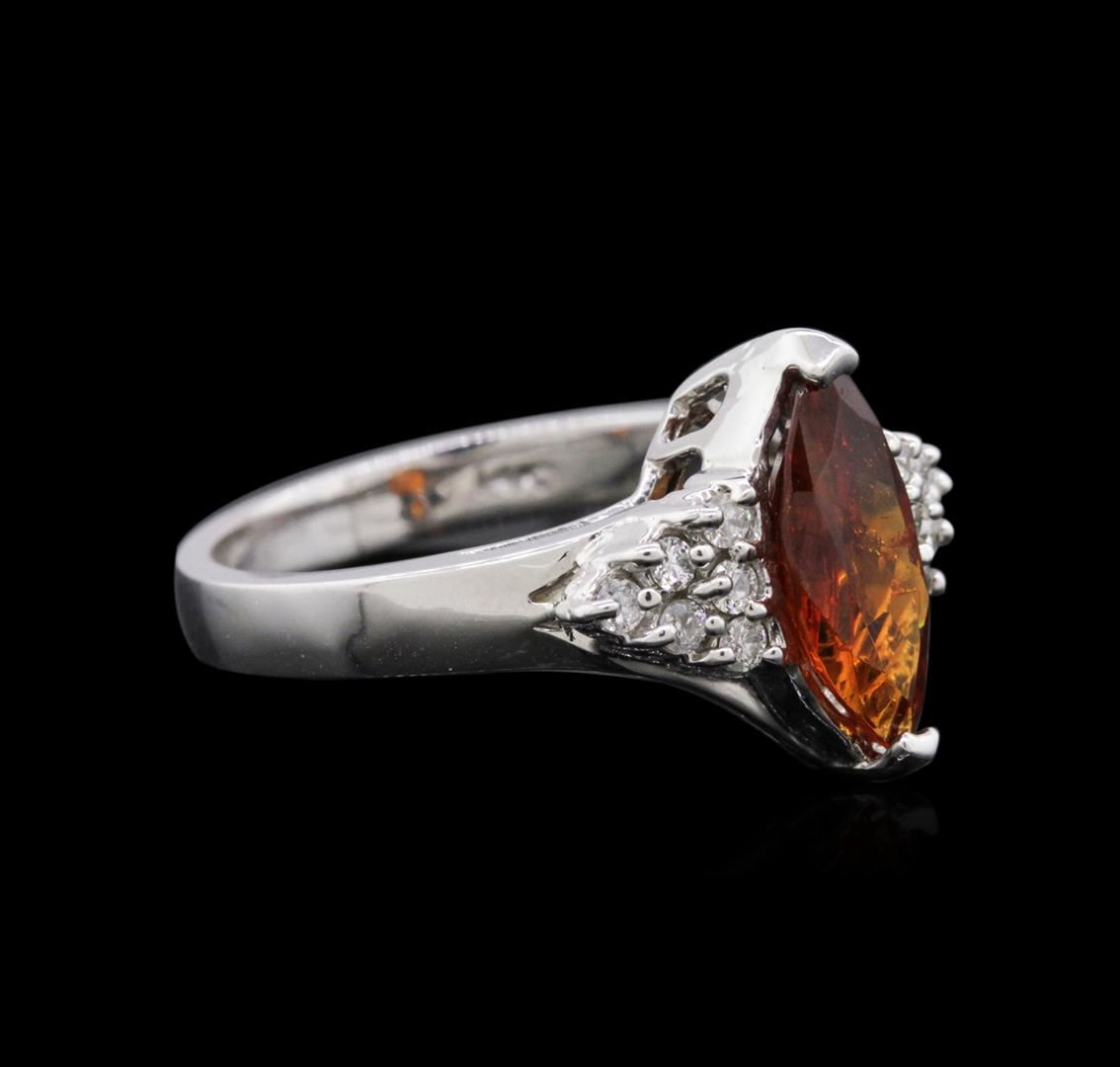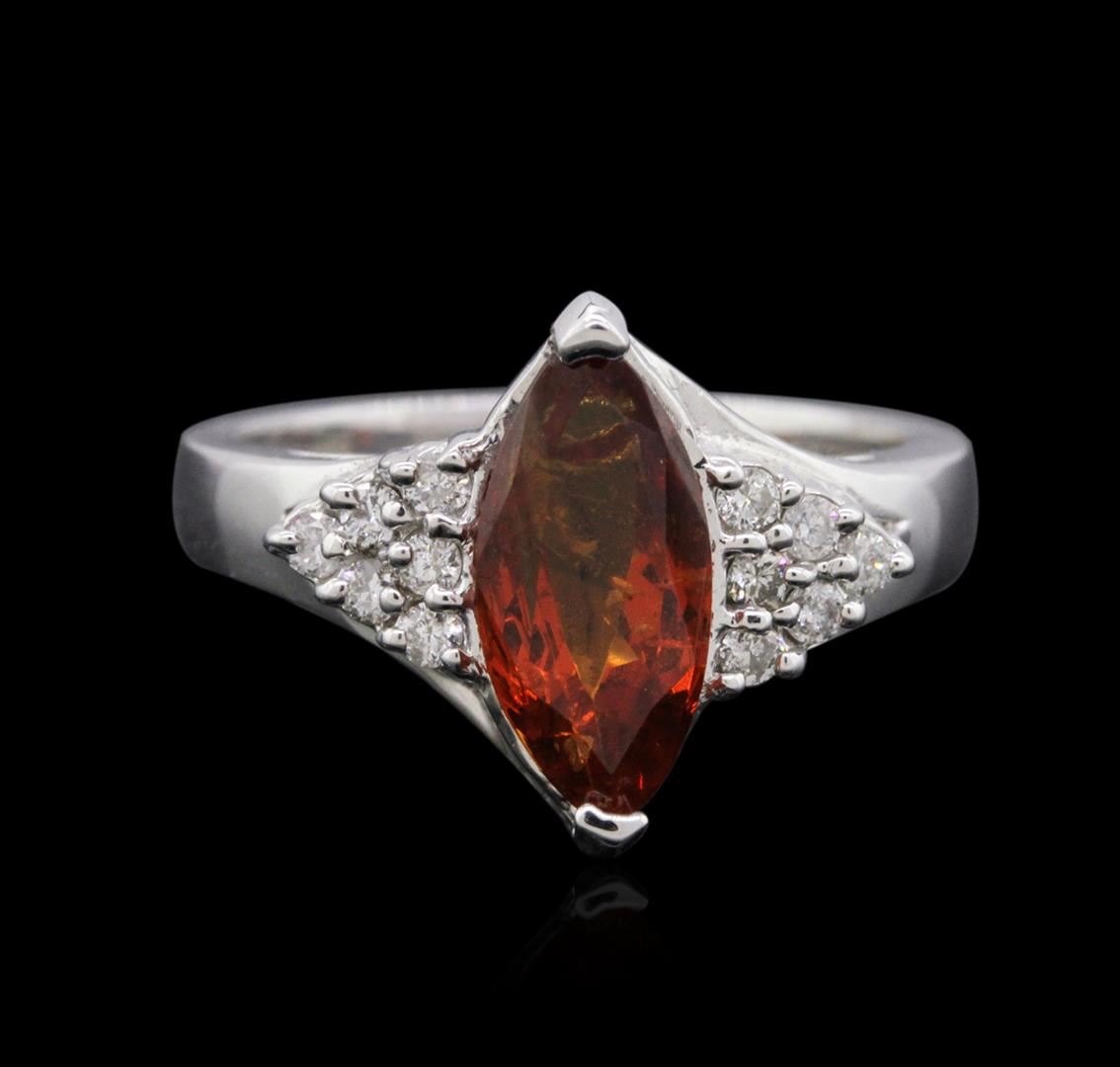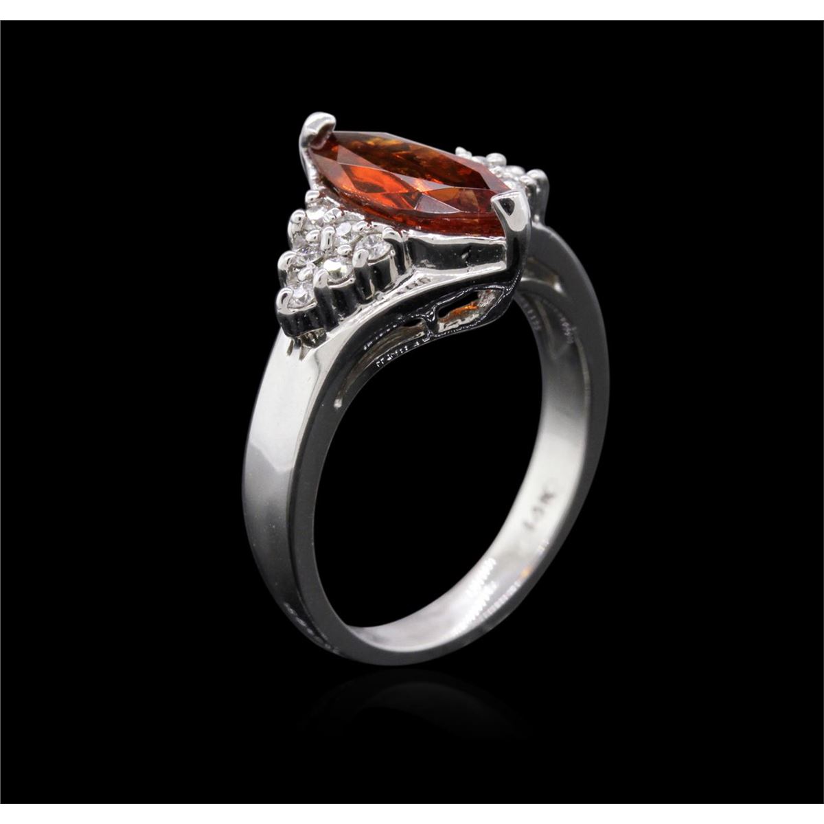 One electronically tested 14KT white gold ladies combination cast & assembled garnet and diamond ring with a flat shank with a bright polish finish. Identified with markings of "14KT". Condition is new. Containing: One prong set marquise modified step cut natural malaya garnet, measuring 12.00 x 5.60 x 3.64mm, approximate weight of 1.78ct., clarity is slightly included, type II, medium, moderately strong, orange color, (GIA O 5/4), cut is good. Twelve prong set round brilliant cut diamonds, measuring 1.30 - 1.30 x 0.78mm (depth est.) approximate total weight of 12 Stones = 0.10ct. Clarity: SI-2 to I-1. Color: I - J, Cut is Good. All diamonds and colored gemstones are graded in the mounting, unless otherwise stated. Colored gemstones are presumed to have been subjected to commonly used enhancement processes. Total Weight of Colored Stones 1.78ct. Total Weight of Diamonds 0.10ct. Total Weight of Ring 5.40 grams. GGL Appraised at $3,070.00.