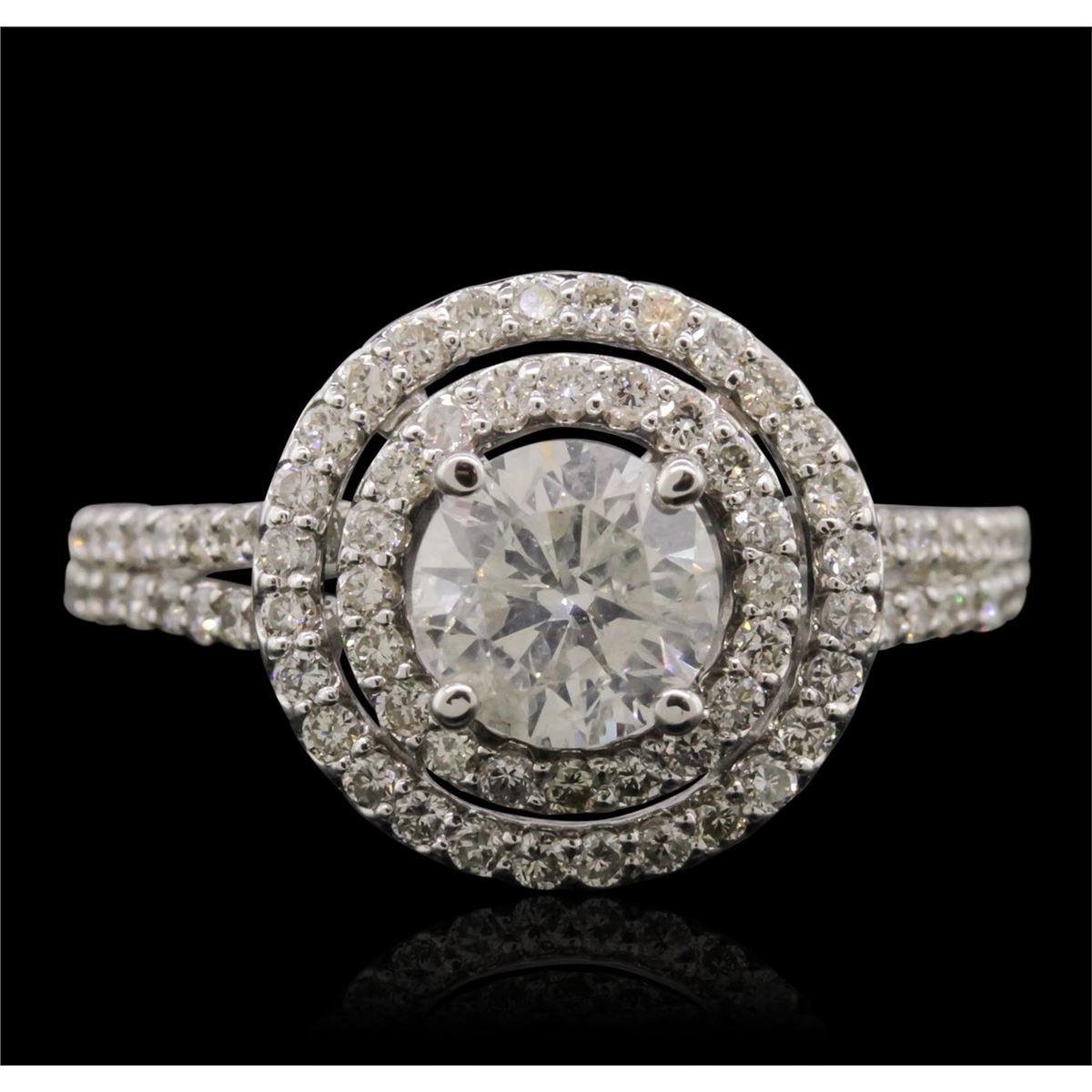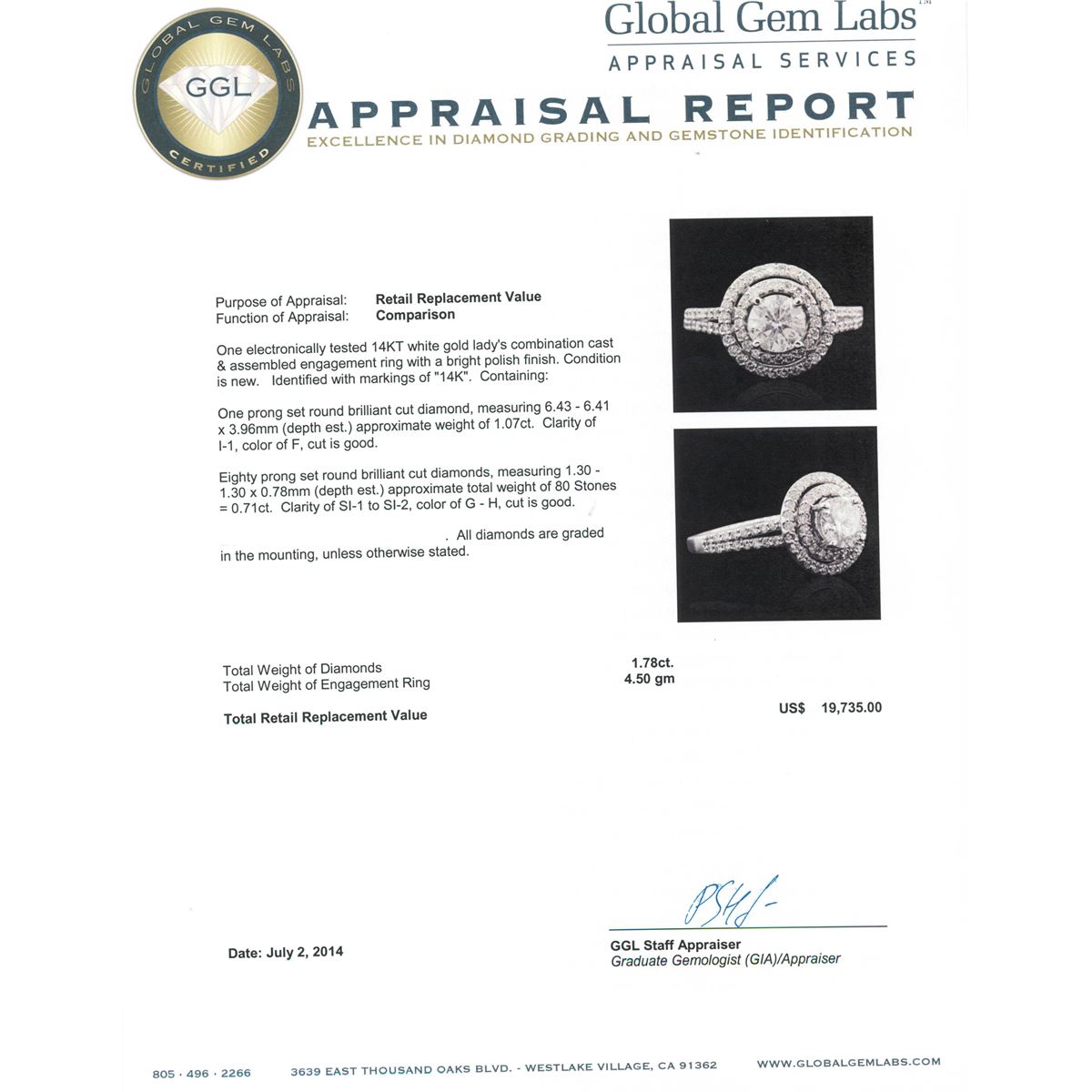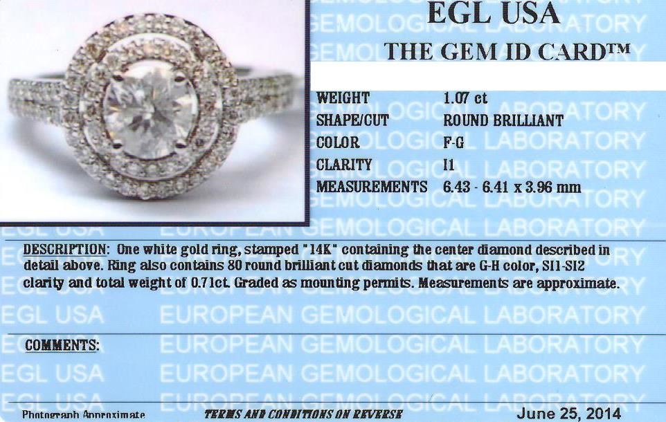 One electronically tested 14KT white gold Ladies combination cast & assembled engagement ring with a bright polish finish. Condition is new. Identified with markings of "14K". Containing: One prong set round brilliant cut diamond, measuring 6.43 - 6.41 x 3.96mm (depth est.) approximate weight of 1.07ct. Clarity: I-1. Color: F, Cut is Good. Eighty prong set round brilliant cut diamonds, measuring 1.30 - 1.30 x 0.78mm (depth est.) approximate. Total Weight of 80 Stones = 0.71ct. Clarity: SI-1 to SI-2. Color: G - H, Cut is Good. EGL USA GEM ID# US 911348414D. All diamonds are graded in the mounting, unless otherwise stated. Total Weight of Diamonds 1.78ct. Total Weight of Engagement Ring 4.50 grams. GGL Appraised at $19,735.00.
