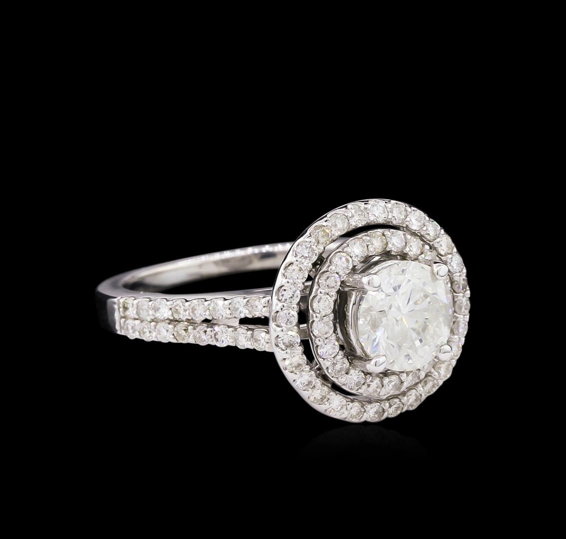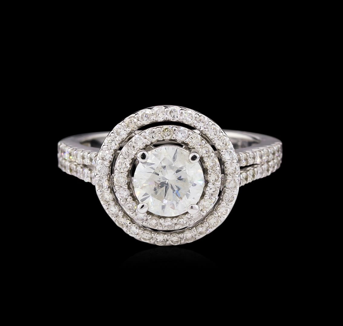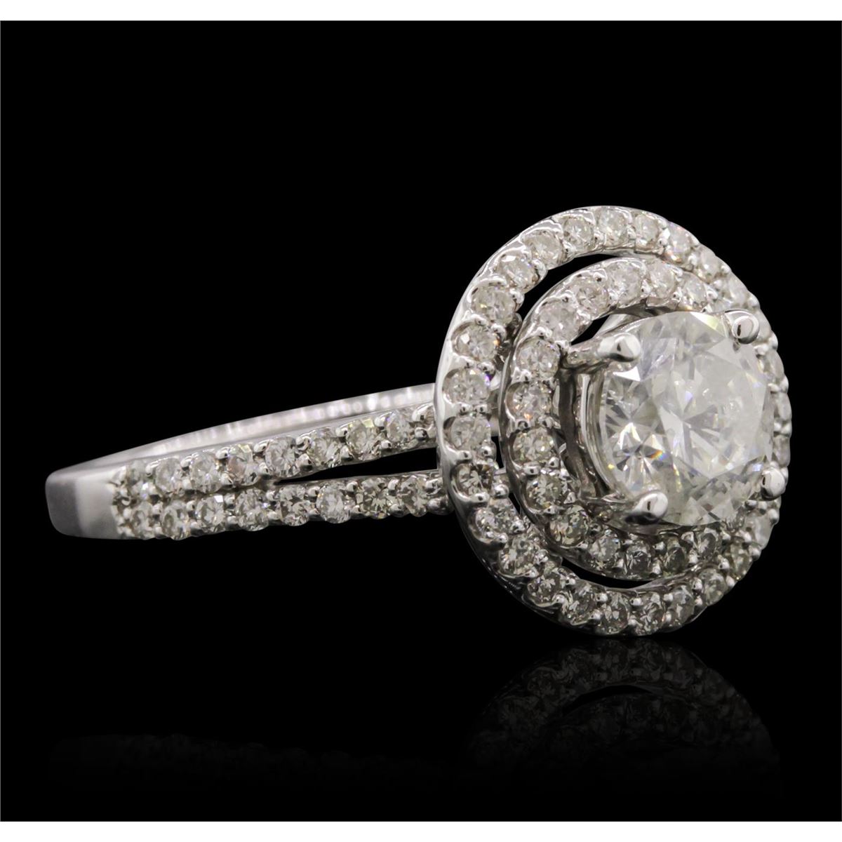 One electronically tested 14KT white gold Ladies combination cast & assembled engagement ring with a bright polish finish. Condition is new. Identified with markings of "14K". Containing: One prong set round brilliant cut diamond, measuring 6.43 - 6.41 x 3.96mm (depth est.) approximate weight of 1.07ct. Clarity: I-1. Color: F, Cut is Good. Eighty prong set round brilliant cut diamonds, measuring 1.30 - 1.30 x 0.78mm (depth est.) approximate. Total Weight of 80 Stones = 0.71ct. Clarity: SI-1 to SI-2. Color: G - H, Cut is Good. EGL USA GEM ID# US 911348414D. All diamonds are graded in the mounting, unless otherwise stated. Total Weight of Diamonds 1.78ct. Total Weight of Engagement Ring 4.50 grams. GGL Appraised at $19,735.00.