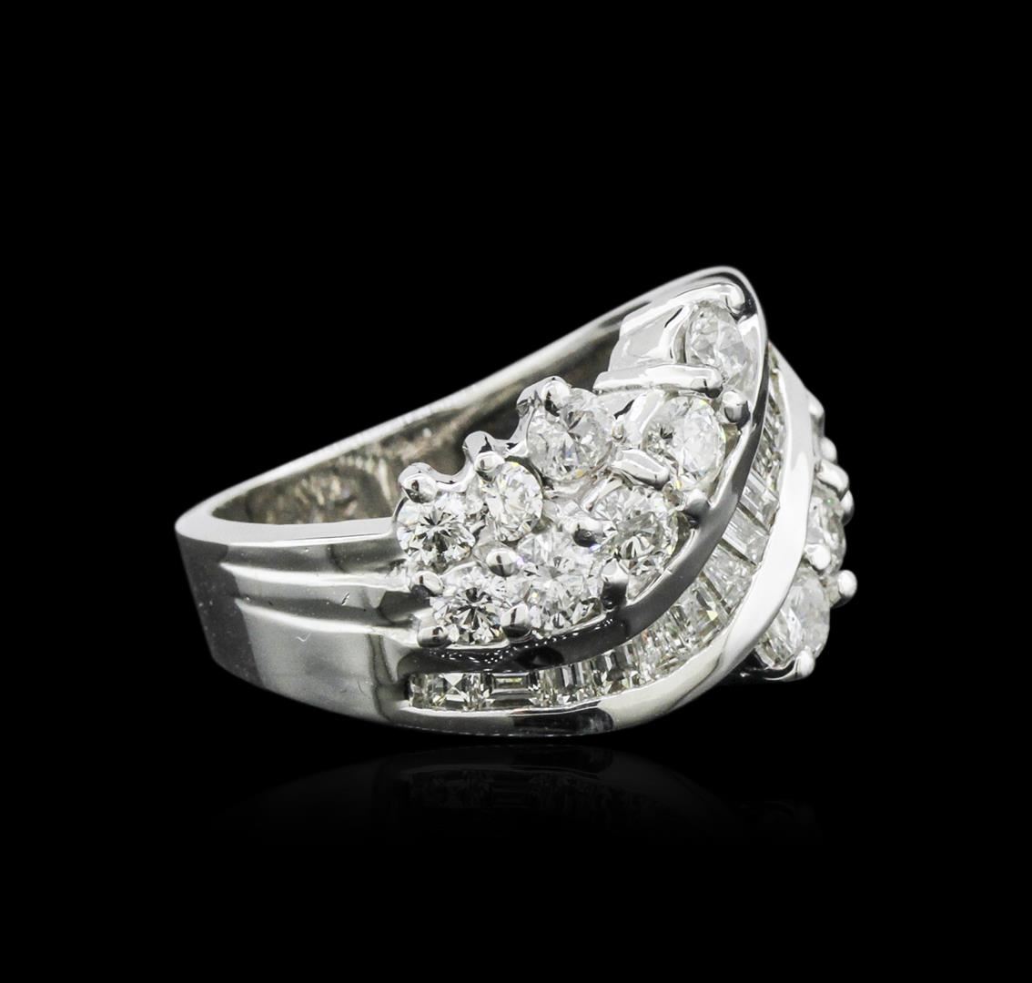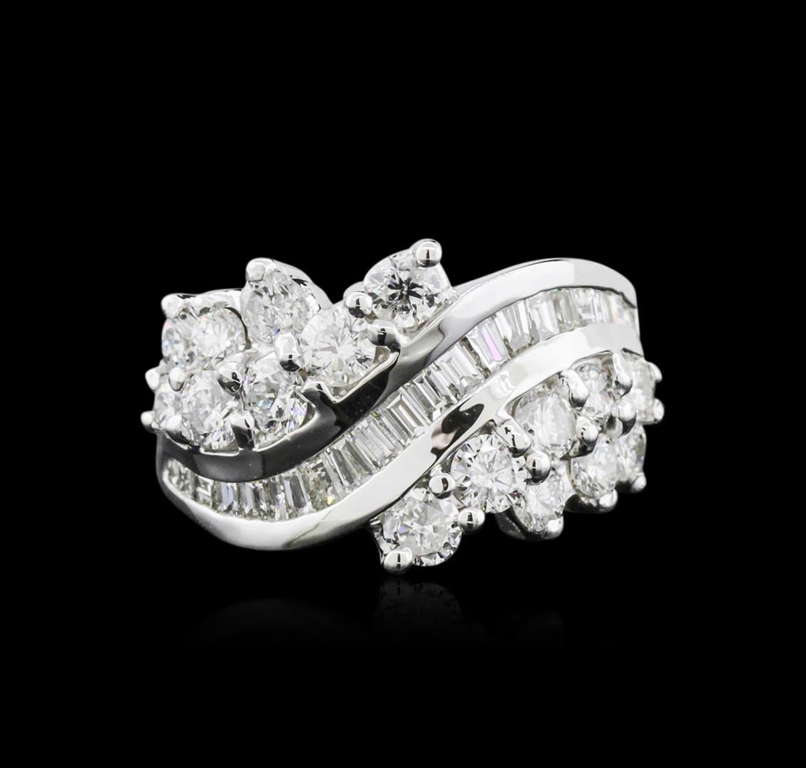 One electronically tested 14KT white gold ladies cast diamond ring with a bright polish finish. Identified with markings of "14K". Condition is new. Containing: Eighteen channel set baguette cut diamonds, measuring from 1.30 x 1.30 x 1.11mm (depth est.) to 2.80 x 1.50 x 1.28mm (depth est.) approximate total weight of 18 Stones = 0.56ct. Clarity: VS-1. Color: H - I, Cut is Good. Sixteen prong set round brilliant cut diamonds, measuring 3.00 - 2.50 x 1.65mm (depth est.) approximate total weight of 16 Stones = 1.22ct. Clarity: SI-1 to I-1. Color: I - J, Cut is Good. All diamonds are graded in the mounting, unless otherwise stated. Total Weight of Diamonds 1.78ct. Total Weight of Ring 9.10 grams. GGL Appraised at $5,285.00.