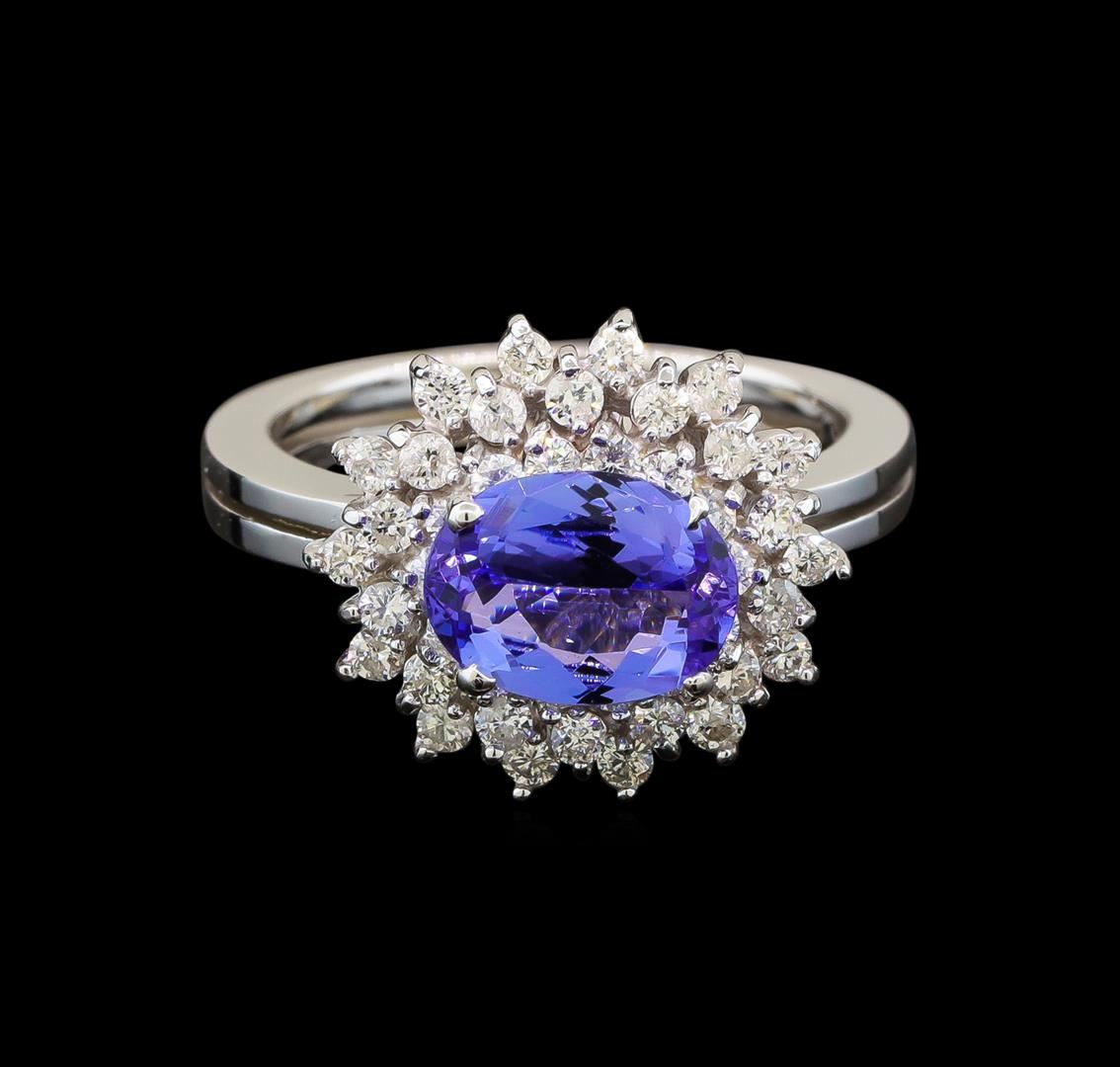 One electronically tested 14KT white gold ladies cast tanzanite and diamond ring with a bright polish finish. Identified with markings of "K14". Condition is new. Containing: One prong set oval modified brilliant cut natural tanzanite, measuring 8.90 x 6.80 x 4.20mm, approximate weight of 1.79ct., clarity is eye clean, type I, medium light, very slightly grayish, violet color, (GIA V 4/3), cut is good. Forty-Two prong set round brilliant cut diamonds, measuring 1.50 - 1.30 x 0.84mm (depth est.) approximate total weight of 42 Stones = 0.42ct. Clarity: SI-1 to SI-2. Color: H - I, Cut is Good. Colored gemstones are presumed to have been subjected to commonly used enhancement processes. All diamonds and colored gemstones are graded in the mounting, unless otherwise stated. Total Weight of Colored Stones 1.79ct. Total Weight of Diamonds 0.42ct. Total Weight of Ring 5.10 grams. GGL Appraised at $3,705.00.