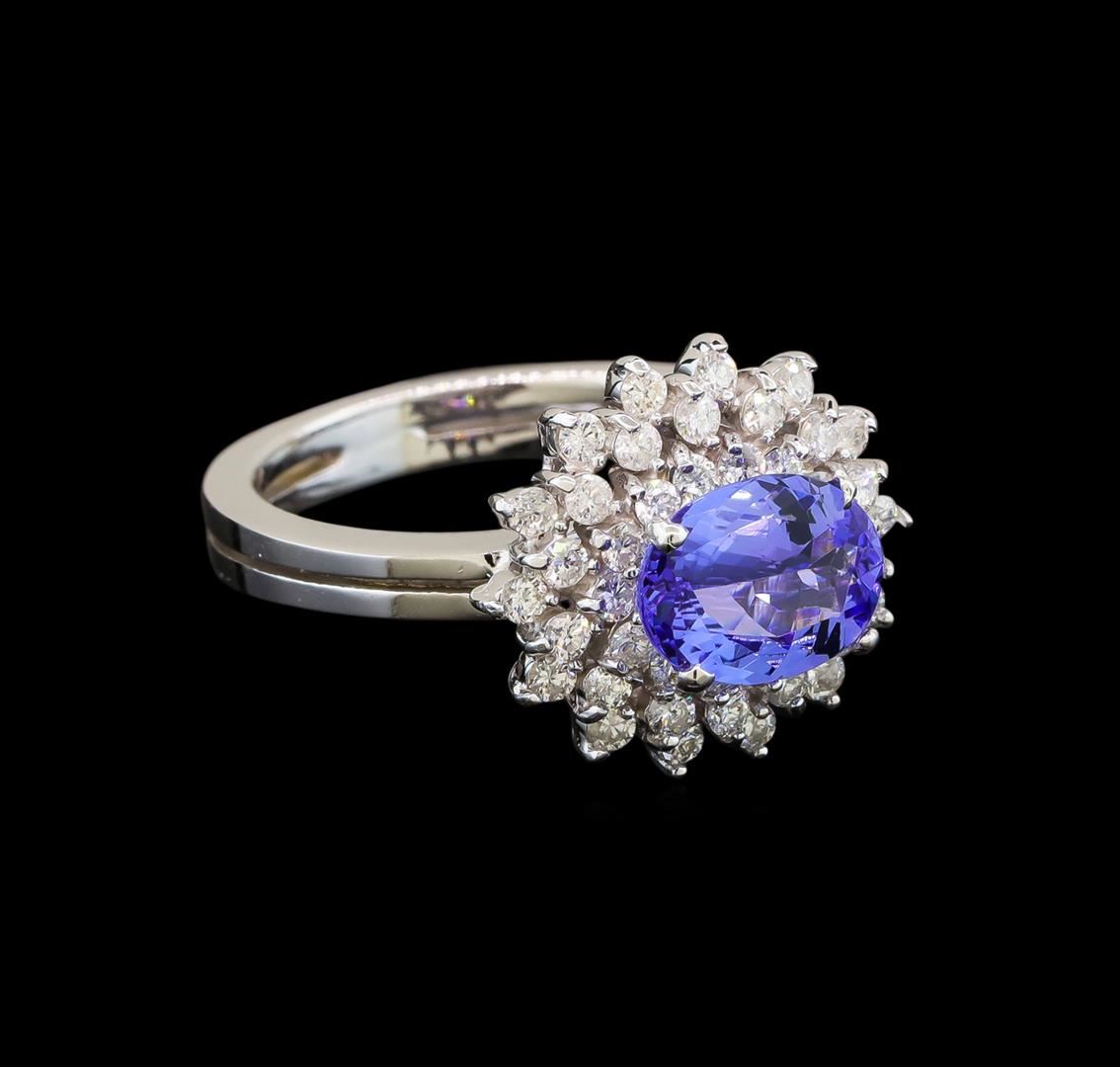 One electronically tested 14KT white gold ladies cast tanzanite and diamond ring with a bright polish finish. Identified with markings of "K14". Condition is new. Containing: One prong set oval modified brilliant cut natural tanzanite, measuring 8.90 x 6.80 x 4.20mm, approximate weight of 1.79ct., clarity is eye clean, type I, medium light, very slightly grayish, violet color, (GIA V 4/3), cut is good. Forty-Two prong set round brilliant cut diamonds, measuring 1.50 - 1.30 x 0.84mm (depth est.) approximate total weight of 42 Stones = 0.42ct. Clarity: SI-1 to SI-2. Color: H - I, Cut is Good. Colored gemstones are presumed to have been subjected to commonly used enhancement processes. All diamonds and colored gemstones are graded in the mounting, unless otherwise stated. Total Weight of Colored Stones 1.79ct. Total Weight of Diamonds 0.42ct. Total Weight of Ring 5.10 grams. GGL Appraised.