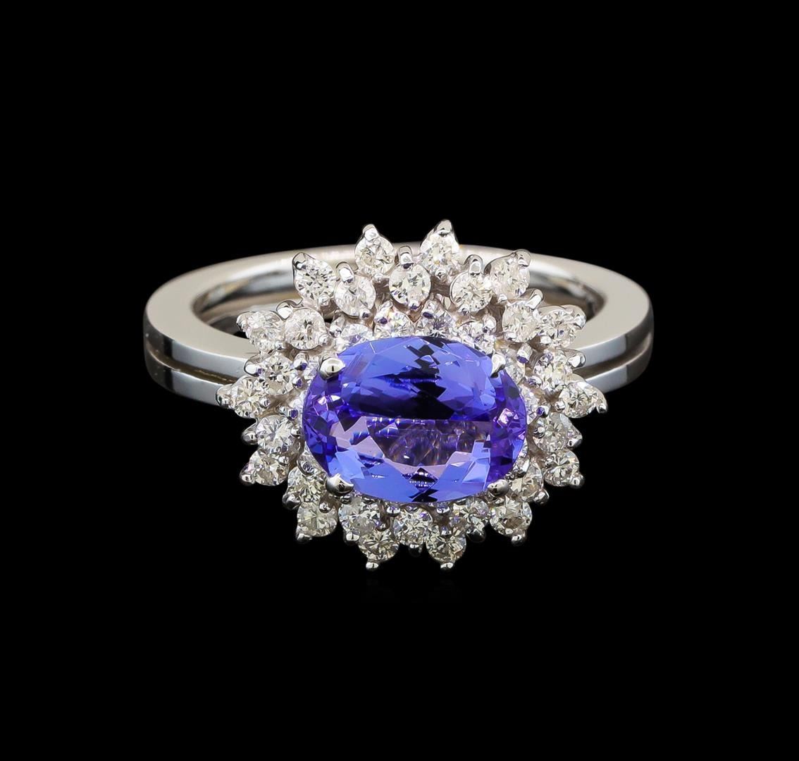 One electronically tested 14KT white gold ladies cast tanzanite and diamond ring with a bright polish finish. Identified with markings of "K14". Condition is new. Containing: One prong set oval modified brilliant cut natural tanzanite, measuring 8.90 x 6.80 x 4.20mm, approximate weight of 1.79ct., clarity is eye clean, type I, medium light, very slightly grayish, violet color, (GIA V 4/3), cut is good. Forty-Two prong set round brilliant cut diamonds, measuring 1.50 - 1.30 x 0.84mm (depth est.) approximate total weight of 42 Stones = 0.42ct. Clarity: SI-1 to SI-2. Color: H - I, Cut is Good. Colored gemstones are presumed to have been subjected to commonly used enhancement processes. All diamonds and colored gemstones are graded in the mounting, unless otherwise stated. Total Weight of Colored Stones 1.79ct. Total Weight of Diamonds 0.42ct. Total Weight of Ring 5.10 grams. GGL Appraised.
