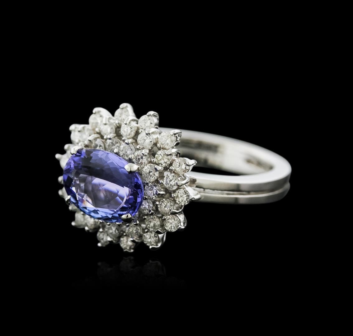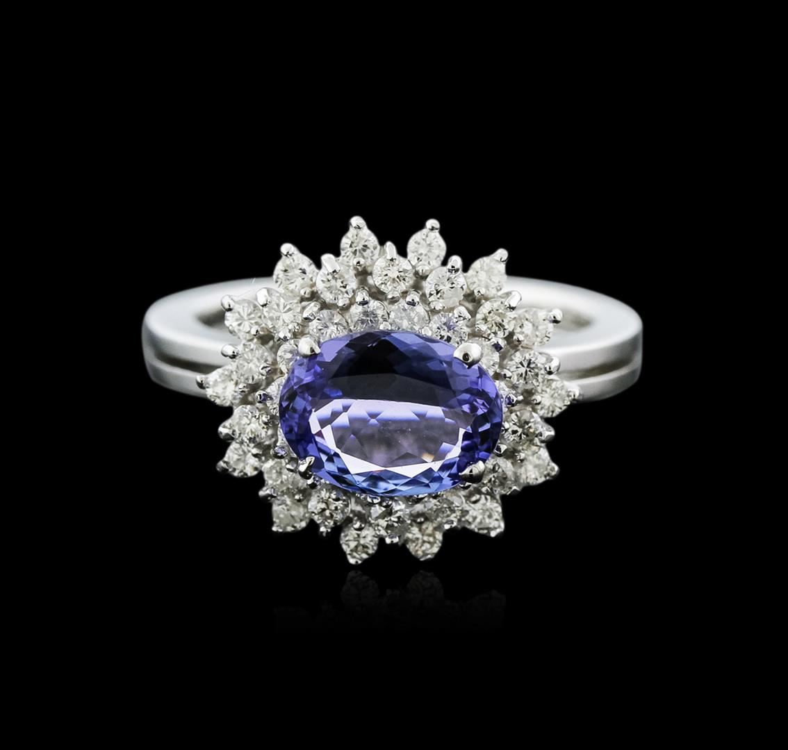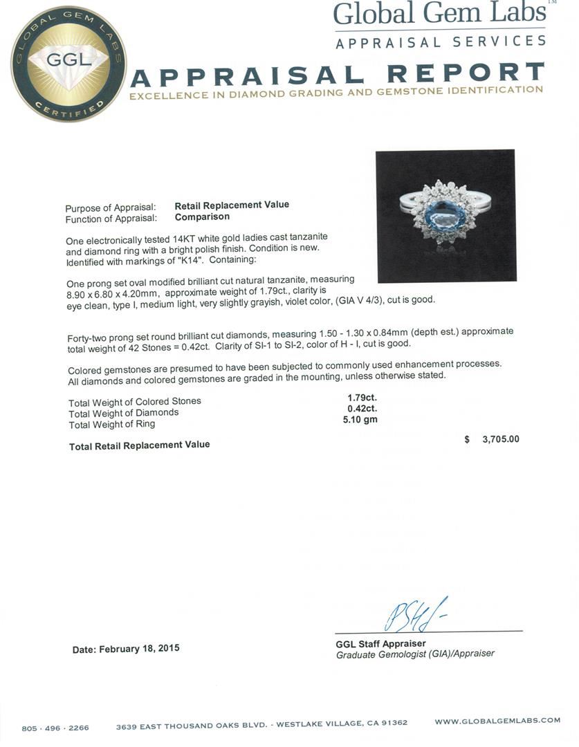 One electronically tested 14KT white gold ladies cast tanzanite and diamond ring with a bright polish finish. Identified with markings of "K14". Condition is new. Containing: One prong set oval modified brilliant cut natural tanzanite, measuring 8.90 x 6.80 x 4.20mm, approximate weight of 1.79ct., clarity is eye clean, type I, medium light, very slightly grayish, violet color, (GIA V 4/3), cut is good. Forty-Two prong set round brilliant cut diamonds, measuring 1.50 - 1.30 x 0.84mm (depth est.) approximate total weight of 42 Stones = 0.42ct. Clarity: SI-1 to SI-2. Color: H - I, Cut is Good. Colored gemstones are presumed to have been subjected to commonly used enhancement processes. All diamonds and colored gemstones are graded in the mounting, unless otherwise stated. Total Weight of Colored Stones 1.79ct. Total Weight of Diamonds 0.42ct. Total Weight of Ring 5.10 grams. GGL Appraised at $3,705.00.