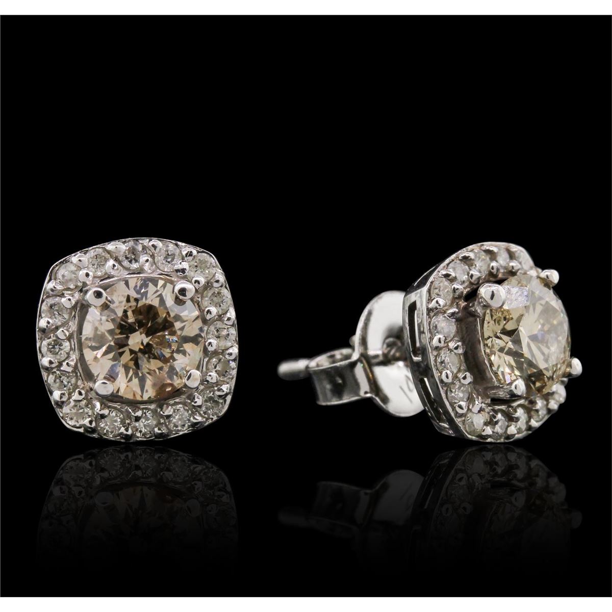 One pair electronically tested 14KT white gold cast diamond earrings with standard backs. Condition is new, good workmanship. Each earring features a diamond set within a diamond bezel. Bright polish finish. Identified with markings of "585". Containing: Two prong set round brilliant cut diamonds, measuring 5.65 - 5.60 x 3.38mm (depth est.) approximate. Total Weight of 2 Stones = 1.41ct. Color grade is an average for the pair. Graded in the setting. Clarity: I-1 Thirty-Two prong set round brilliant cut diamonds, measuring 1.40 - 1.30 x 0.81mm (depth est.) approximate. Total Weight of 32 Stones = 0.38ct. Graded in the setting. Clarity: I-1 to I-2. Color: H - J. Total Weight of Diamonds 1.79ct. Total Weight of Earrings 2.65 grams. AIG Appraised at $7,960.00.