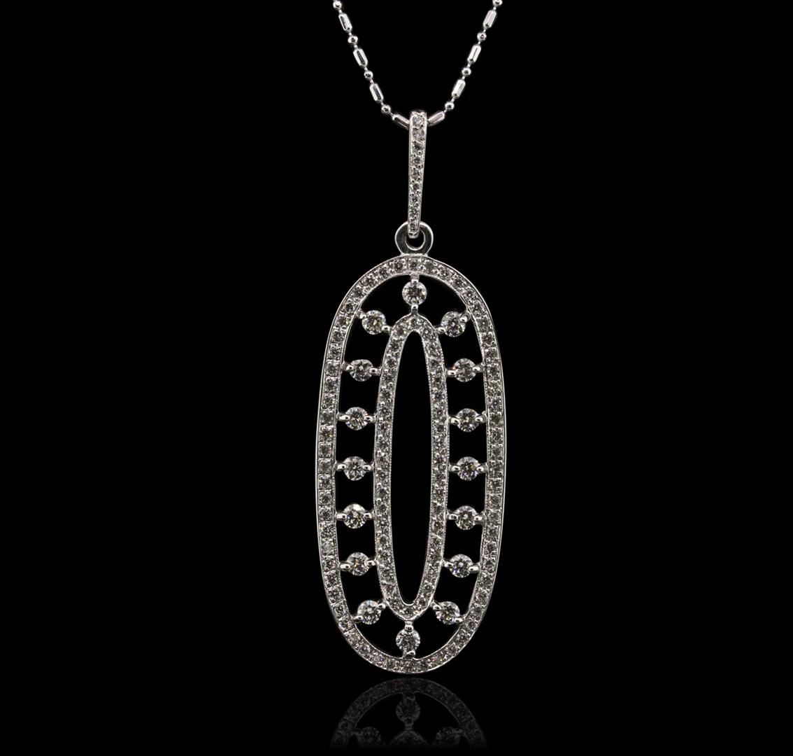 One electronically tested 14KT white gold ladies combination cast & die struck pendant & chain 18.0" long, small fancy link with a spring ring clasp with a bright polish finish. Condition is new. Identified with markings of "14K". Containing: Sixteen prong set round brilliant cut diamonds, measuring 2.50 - 2.50 x 1.50mm (depth est.) approximate. Total Weight of 16 Stones = 0.91ct. Clarity: SI-1. Color: I - J, Cut is Good. One Hundred Nine prong set round brilliant cut diamonds, measuring 1.30 - 1.30 x 0.78mm (depth est.) approximate. Total Weight of 109 Stones = 0.87ct. Clarity: SI-2 to I-1. Color: I - J, Cut is Good. All diamonds are graded in the mounting, unless otherwise stated. Total Weight of Diamonds 1.79ct. Total Weight of Pendant & Chain 11.90 grams. GGL Appraised at $9,210.00.