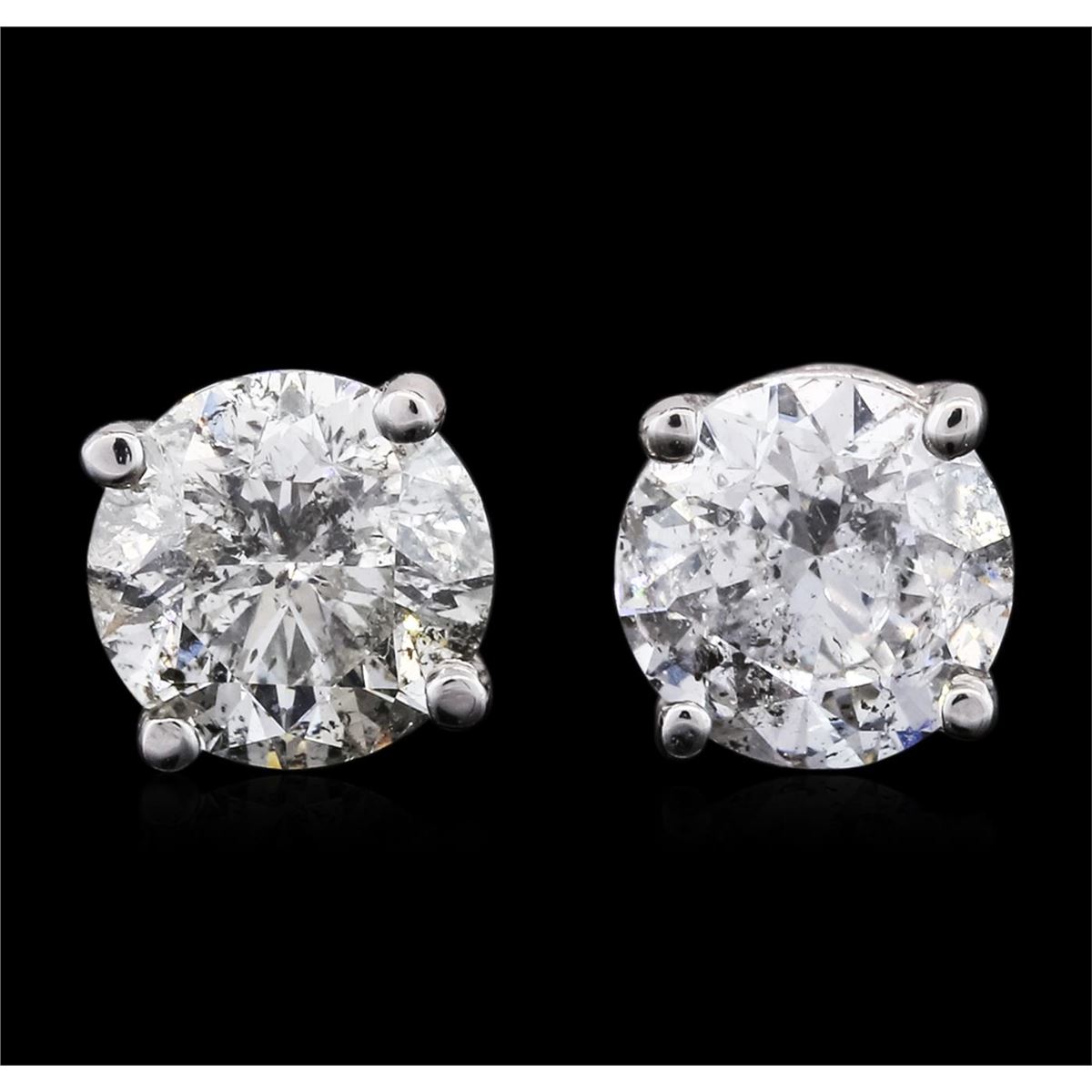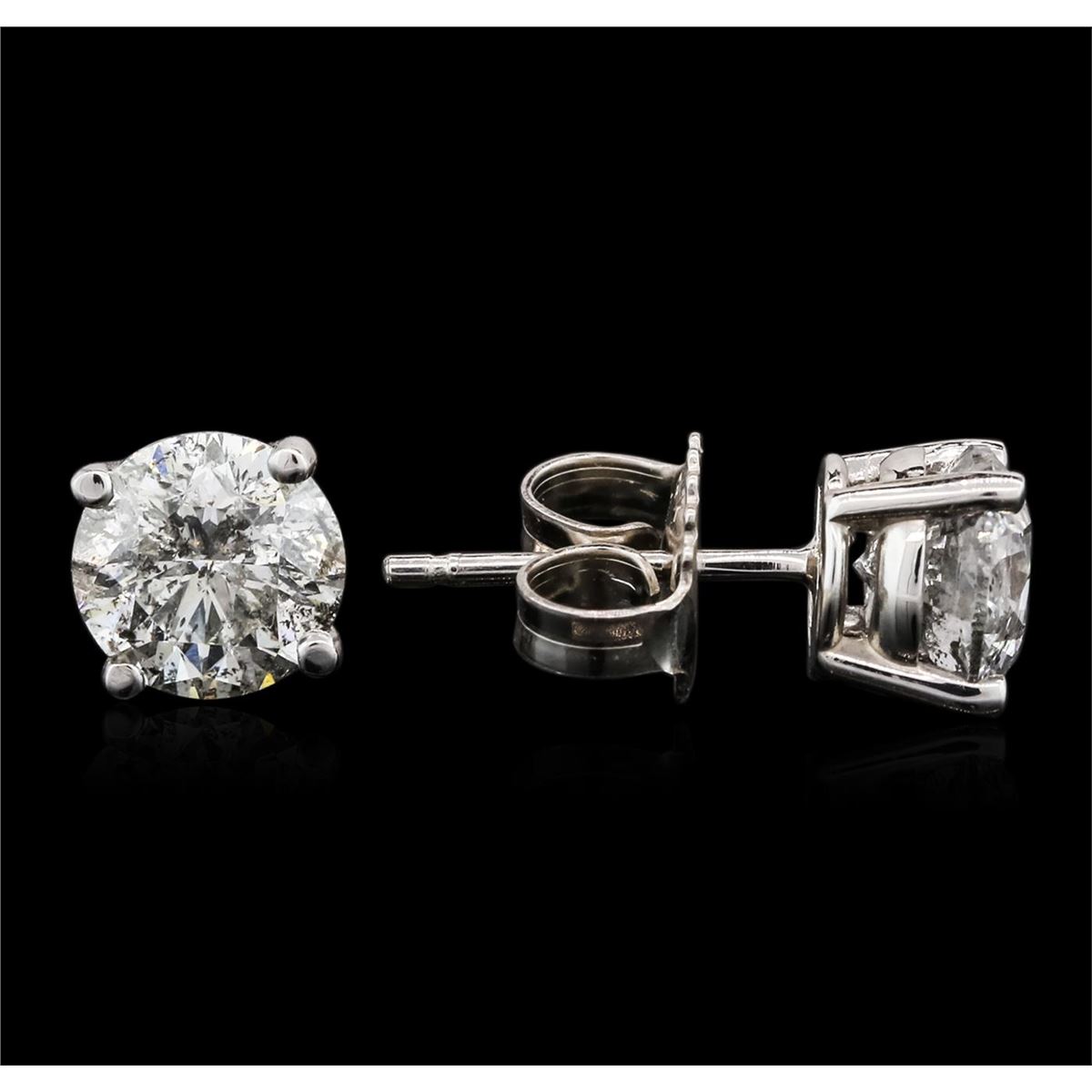 One pair electronically tested 14KT white gold ladies cast diamond stud earrings with friction posts with a bright polish finish. Identified with markings of "14K". Condition is new. Containing: One prong set round brilliant cut diamond, measuring 6.30 - 6.20 x 3.75mm (depth est.) approximate weight of 0.89ct. Clarity: I-3. Color: J, Cut is Good. One prong set round brilliant cut diamond, measuring 6.30 - 6.20 x 3.75mm (depth est.) approximate weight of 0.89ct. Clarity: I-3. Color: J, Cut is Good. All diamonds are graded in the mounting, unless otherwise stated. Total Weight of Diamonds 1.79ct. Total Weight of Earrings 1.70 grams. GGL Appraised at $4,230.00.