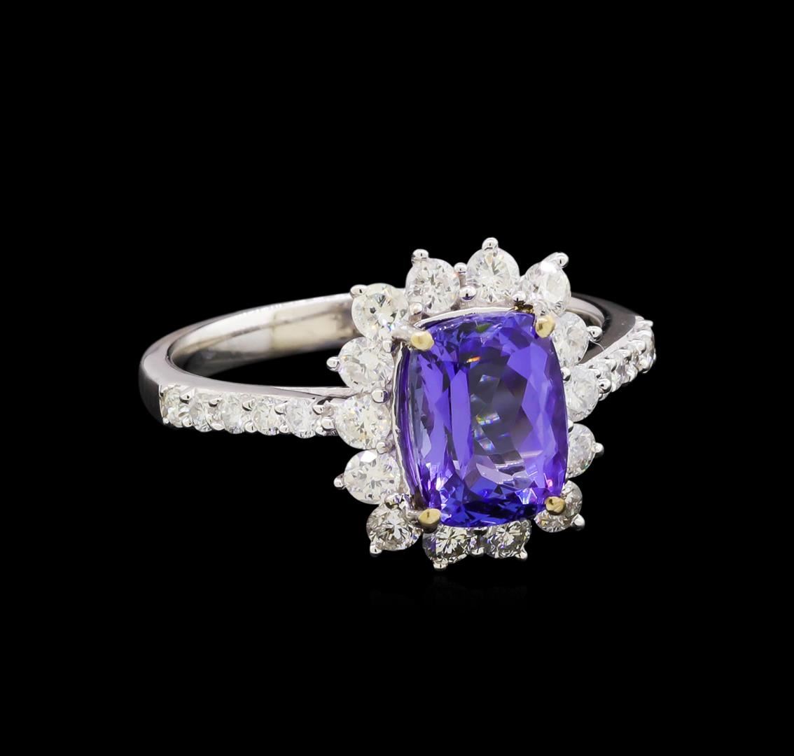 One electronically tested 14KT white gold ladies combination cast & assembled tanzanite and diamond ring with a flat shank with a bright polish finish. Identified with markings of "14K". Condition is new. Containing: One prong set rectangular cushion modified brilliant cut natural tanzanite, measuring 8.56 x 6.53 x 4.08mm, approximate weight of 1.80ct., clarity is eye clean, type I, medium light, moderately strong, violet color, (GIA V 4/4), cut is good. Twenty-Three prong set round brilliant cut diamonds, measuring 2.30 - 1.50 x 1.14mm (depth est.) approximate total weight of 23 Stones = 0.58ct. Clarity: SI-2 to I-2. Color: I - J, Cut is Good. Colored gemstones are presumed to have been subjected to commonly used enhancement processes. All diamonds and colored gemstones are graded in the mounting, unless otherwise stated. Total Weight of Colored Stones 1.80ct. Total Weight of Diamonds 0.58ct. Total Weight of Ring 3.30 grams. GGL Appraised at $4,920.00.