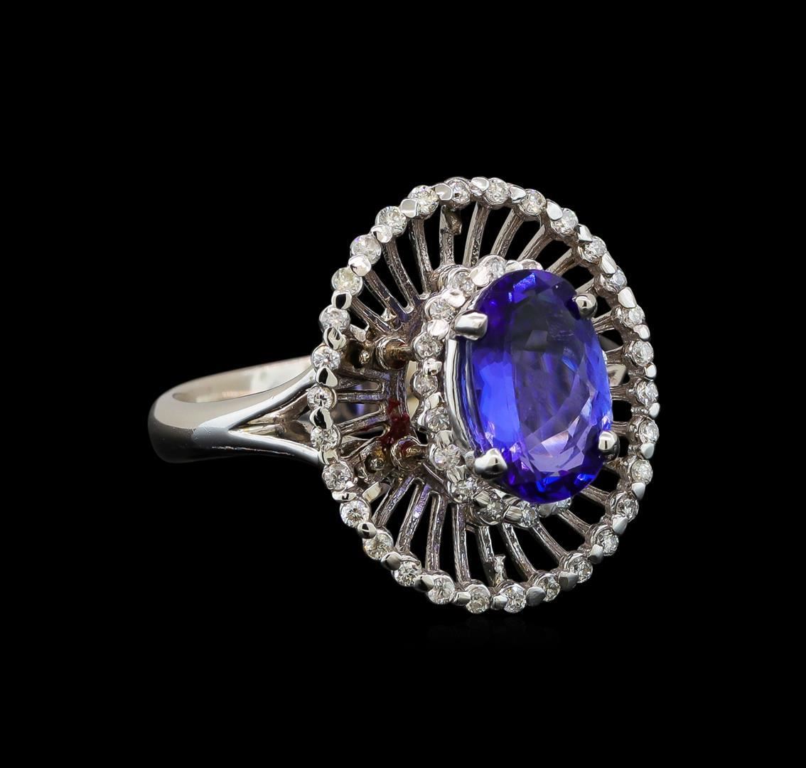One electronically tested 14KT white gold ladies cast tanzanite and diamond ring with a split shoulder shank with a bright polish finish. Identified with markings of "K14". Condition is new. Containing: One prong set oval modified brilliant cut natural tanzanite, measuring 9.90 x 6.30 x 4.10mm, approximate weight of 1.80 ct., clarity is eye clean, type I, medium light, moderately strong, violet color, (GIA V 4/4), cut is good. Forty-Eight prong set round brilliant cut diamonds, measuring 1.10 - 1.10 x 0.66mm (depth est.) approximate total weight of 48 Stones = 0.23ct. Clarity of SI-2 to I-1, Color of I - J, Cut is Good. All diamonds and colored gemstones are graded in the mounting, unless otherwise stated. Colored gemstones are presumed to have been subjected to commonly used enhancement processes. Total Weight of Colored Stones 1.80 ct. Total Weight of Diamonds 0.23ct. Total Weight of Ring 6.30 grams. GGL Appraised.