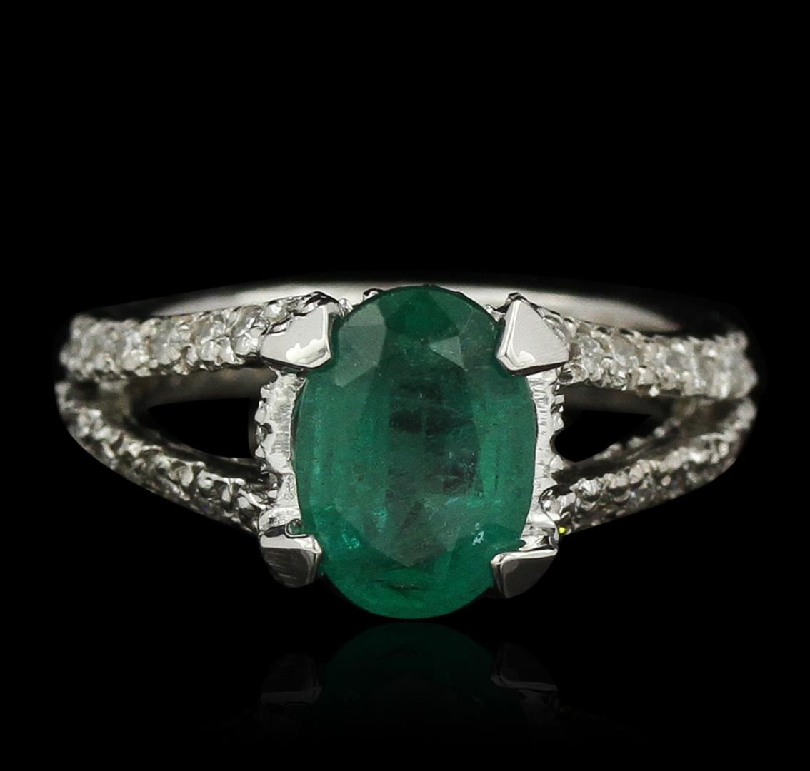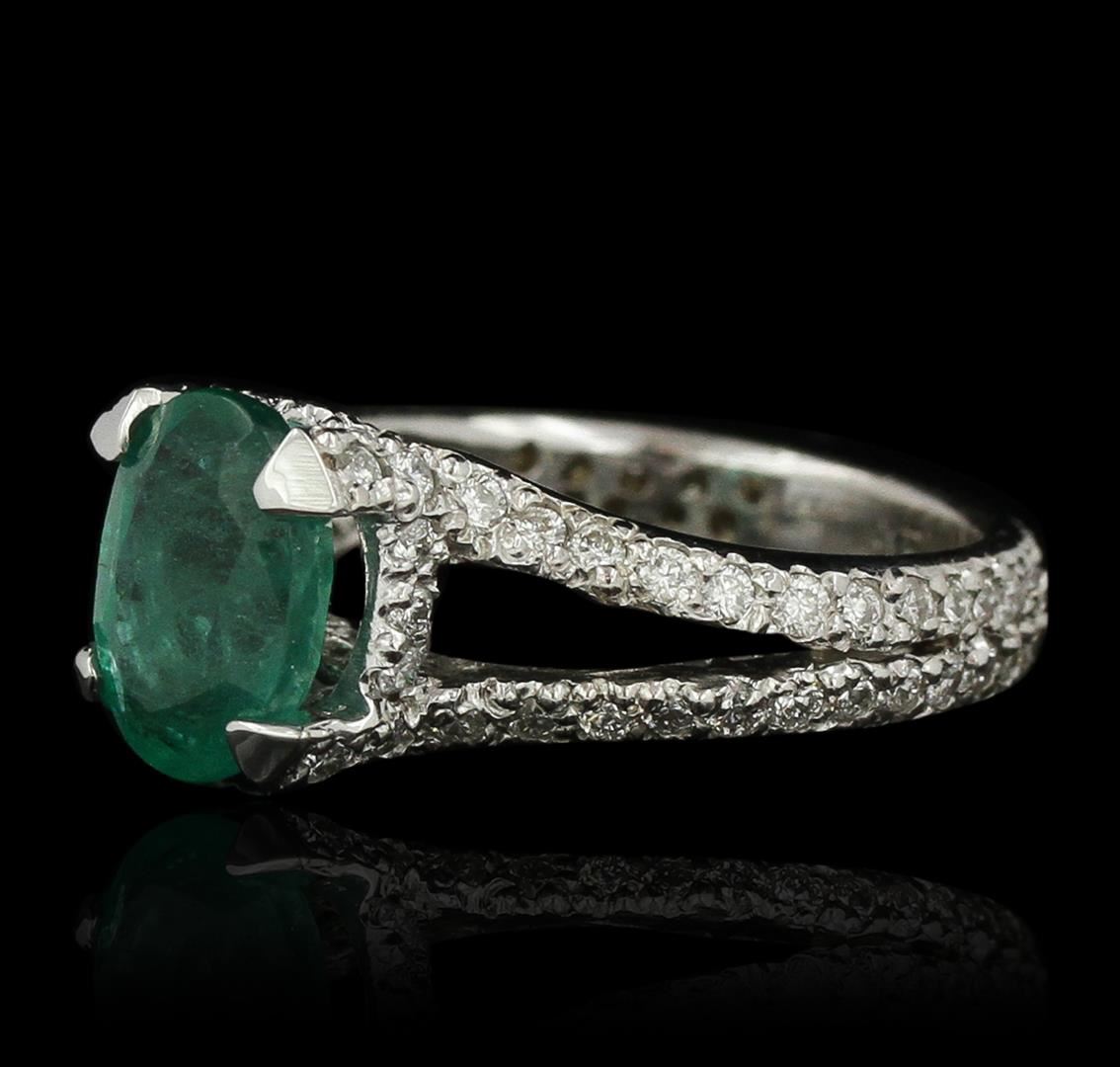 One electronically tested 14KT white gold ladies cast emerald and diamond ring with a bright polish finish. Condition is new, good workmanship. The featured emerald is supported by diamond set split shoulders and completed by a three millimeter wide band. Identified with markings of "14K". Containing: One prong set oval mixed cut natural emerald, measuring 9.50 x 6.80 x 4.60mm, 8%. bulge factor, approximate weight of 1.80ct., clarity is heavily included, type III, medium dark, very slightly grayish, very slightly bluish green color, (GIA vslbG 6/3), cut is good. Transmitting light with a minimum of distortion, transparent to translucent. Naturally occurring internal & external characteristics are present. Indications of oil residue. Graded in the setting. Eighty-Four prong set round brilliant cut diamonds, measuring 1.50 - 1.50 x 0.90mm (depth est.) approximate. Total Weight of 84 Stones = 1.13ct. Graded in the setting. Clarity: SI-2 to I-1. Color: H - J. Total Weight of Colored Stones 1.80ct. Total Weight of Diamonds 1.13ct. Total Weight of Ring 4.80 grams. AIG Appraised at $7,115.00.