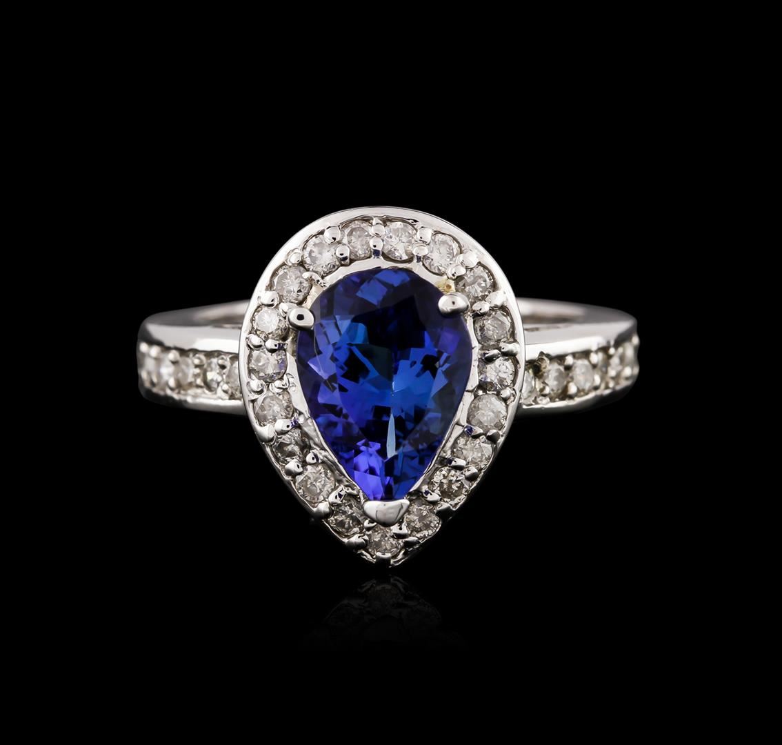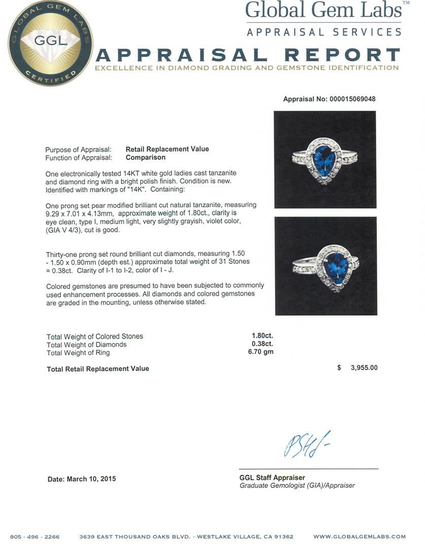 One electronically tested 14KT white gold ladies cast tanzanite and diamond ring with a bright polish finish. Identified with markings of "14K". Condition is new. Containing: One prong set pear modified brilliant cut natural tanzanite, measuring 9.29 x 7.01 x 4.13mm, approximate weight of 1.80ct., clarity is eye clean, type I, medium light, very slightly grayish, violet color, (GIA V 4/3), cut is good. Thirty-One prong set round brilliant cut diamonds, measuring 1.50 - 1.50 x 0.90mm (depth est.) approximate total weight of 31 Stones = 0.38ct. Clarity: I-1 to I-2. Color: I - J. Colored gemstones are presumed to have been subjected to commonly used enhancement processes. All diamonds and colored gemstones are graded in the mounting, unless otherwise stated. Total Weight of Colored Stones 1.80ct. Total Weight of Diamonds 0.38ct. Total Weight of Ring 6.70 grams. GGL Appraised at $3,955.00.