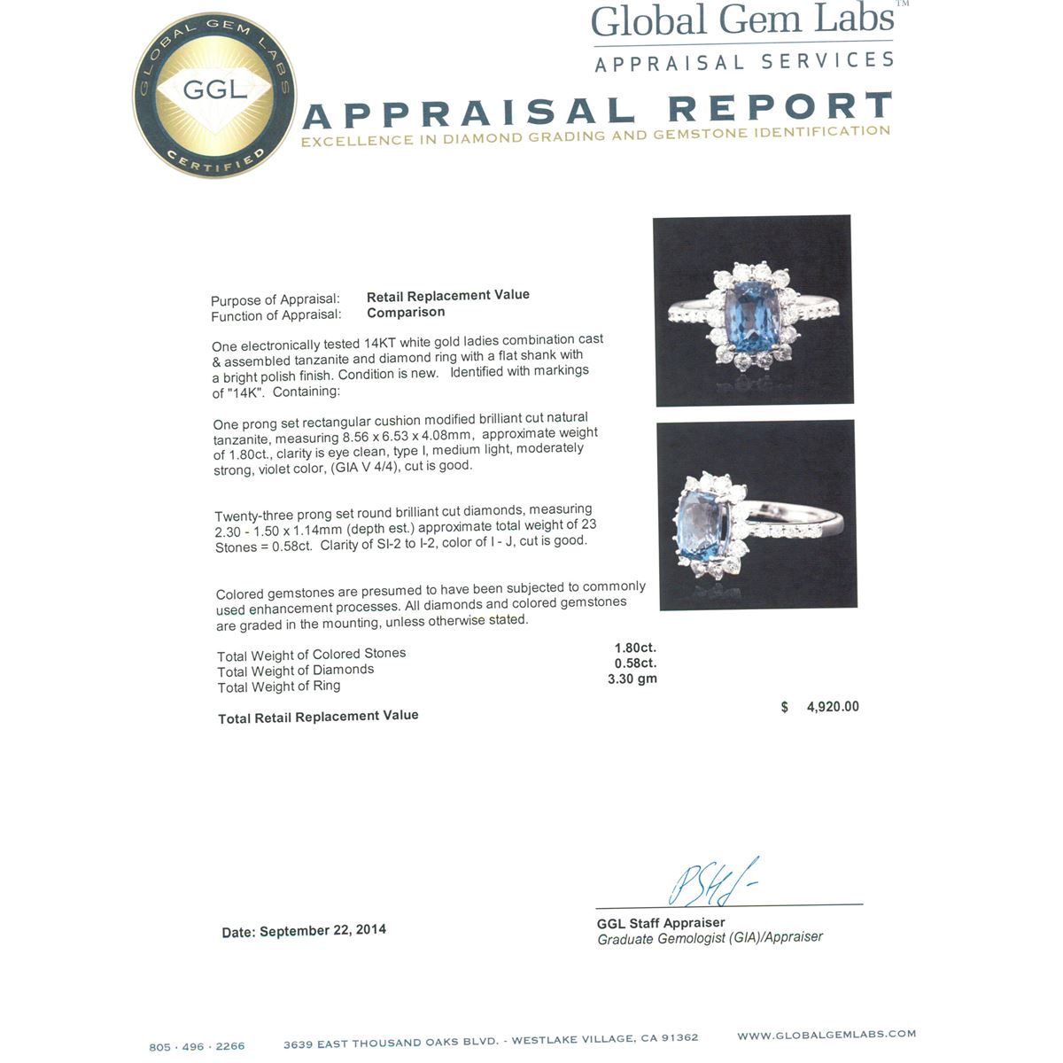 One electronically tested 14KT white gold ladies combination cast & assembled tanzanite and diamond ring with a flat shank with a bright polish finish. Identified with markings of "14K". Condition is new. Containing: One prong set rectangular cushion modified brilliant cut natural tanzanite, measuring 8.56 x 6.53 x 4.08mm, approximate weight of 1.80ct., clarity is eye clean, type I, medium light, moderately strong, violet color, (GIA V 4/4), cut is good. Twenty-Three prong set round brilliant cut diamonds, measuring 2.30 - 1.50 x 1.14mm (depth est.) approximate total weight of 23 Stones = 0.58ct. Clarity: SI-2 to I-2. Color: I - J, Cut is Good. Colored gemstones are presumed to have been subjected to commonly used enhancement processes. All diamonds and colored gemstones are graded in the mounting, unless otherwise stated. Total Weight of Colored Stones 1.80ct. Total Weight of Diamonds 0.58ct. Total Weight of Ring 3.30 grams. GGL Appraised at $4,920.00.