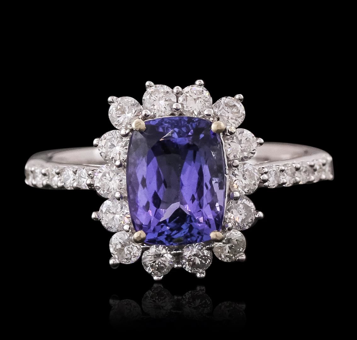 One electronically tested 14KT white gold ladies combination cast & assembled tanzanite and diamond ring with a flat shank with a bright polish finish. Identified with markings of "14K". Condition is new. Containing: One prong set rectangular cushion modified brilliant cut natural tanzanite, measuring 8.56 x 6.53 x 4.08mm, approximate weight of 1.80ct., clarity is eye clean, type I, medium light, moderately strong, violet color, (GIA V 4/4), cut is good. Twenty-Three prong set round brilliant cut diamonds, measuring 2.30 - 1.50 x 1.14mm (depth est.) approximate total weight of 23 Stones = 0.58ct. Clarity: SI-2 to I-2. Color: I - J, Cut is Good. Colored gemstones are presumed to have been subjected to commonly used enhancement processes. All diamonds and colored gemstones are graded in the mounting, unless otherwise stated. Total Weight of Colored Stones 1.80ct. Total Weight of Diamonds 0.58ct. Total Weight of Ring 3.30 grams. GGL Appraised at $4,920.00.