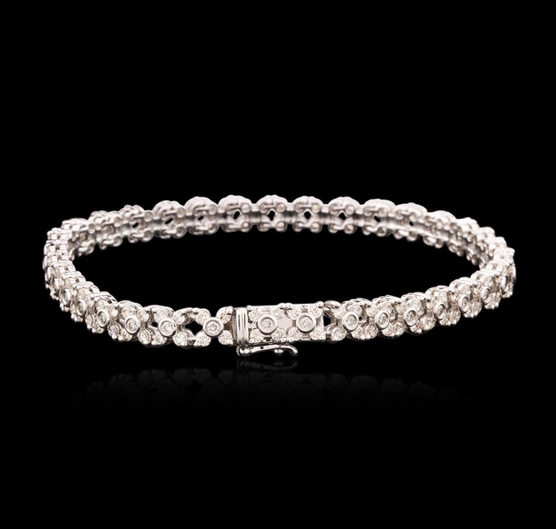 One electronically tested 14KT white gold ladies cast diamond tennis bracelet with a hidden box clasp with a bright polish finish. Measurements: 7" in inch Identified with markings of "585". Condition is new. Containing: One Hundred Eighty prong set round brilliant cut diamonds, measuring 1.50 - 1.30 x 0.84mm (depth est.) approximate total weight of 180 Stones = 1.80ct. Clarity: SI-1 to SI-2. Color: I - J, Cut is Good. All diamonds are graded in the mounting, unless otherwise stated. Total Weight of Diamonds 1.80ct. Total Weight of Tennis Bracelet 14.80 grams. GGL Appraised at $7,400.00.