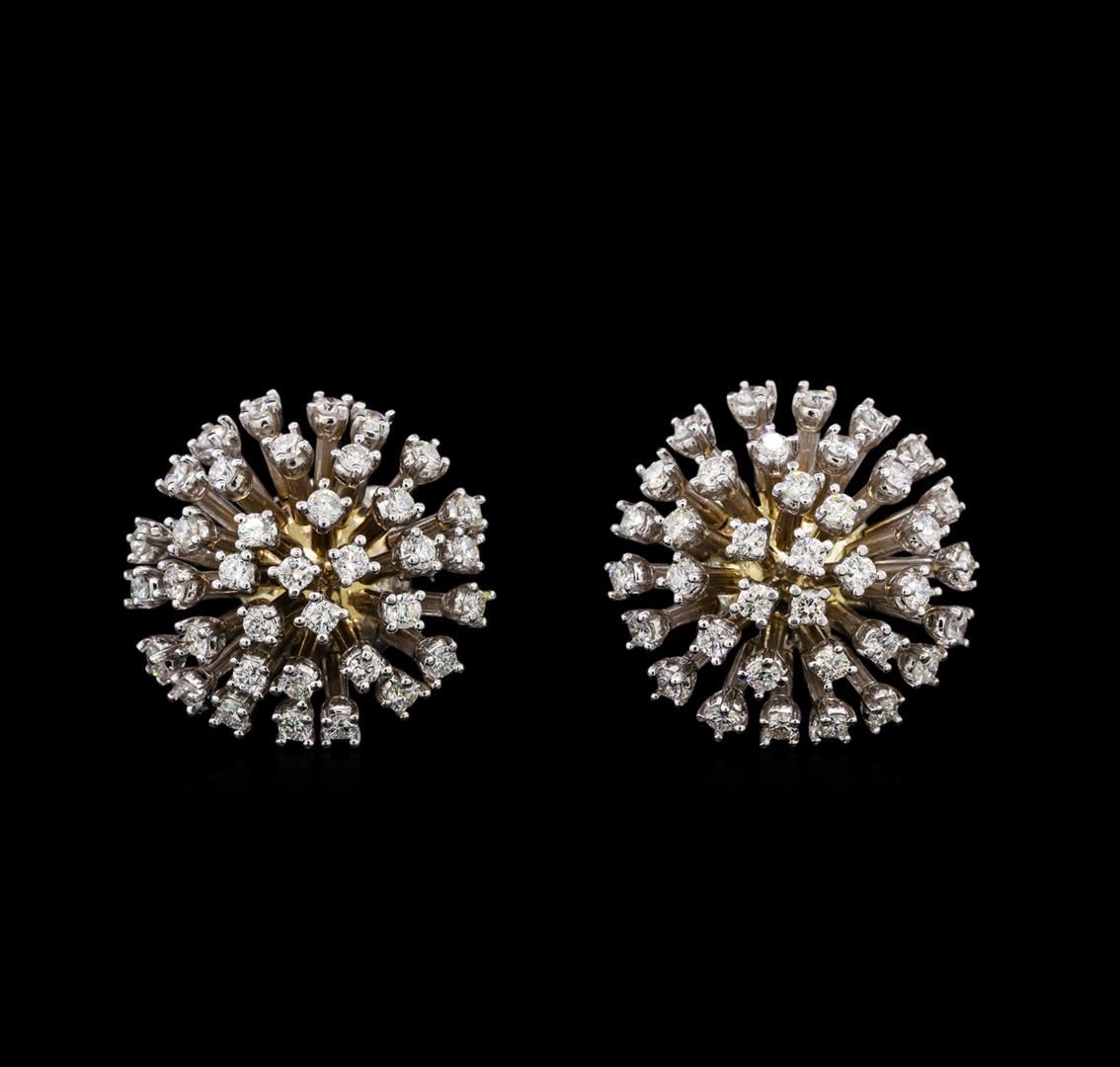 One pair electronically tested 14KT white gold ladies cast & assembled diamond earrings with standard backs. Each earring features a stylized arrangement of independently moving diamond set bursts. Bright polish finish. Identified with markings of "14K". Condition is new, good workmanship. Containing: Seventy-Four prong set round brilliant cut diamonds, measuring 1.90 - 1.80 x 1.11mm (depth est.) approximate total weight of 74 Stones = 1.81ct. Graded in the setting. Clarity: VS-2 to SI-2. Color: G - I. Total Weight of Diamonds 1.81ct. Total Weight of Earrings 16.67 grams. AIG Appraised at $8,500.00.